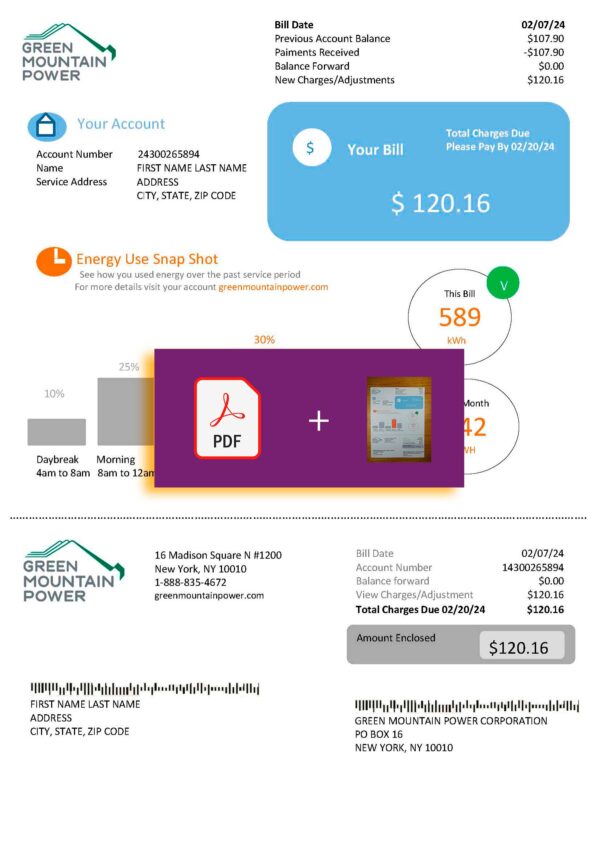 The Green Mountain Energy New York template helps users replicate realistic utility bill layouts for UX and address validation. You might also explore the National Grid format or the PSEG statement for similar high-quality designs.