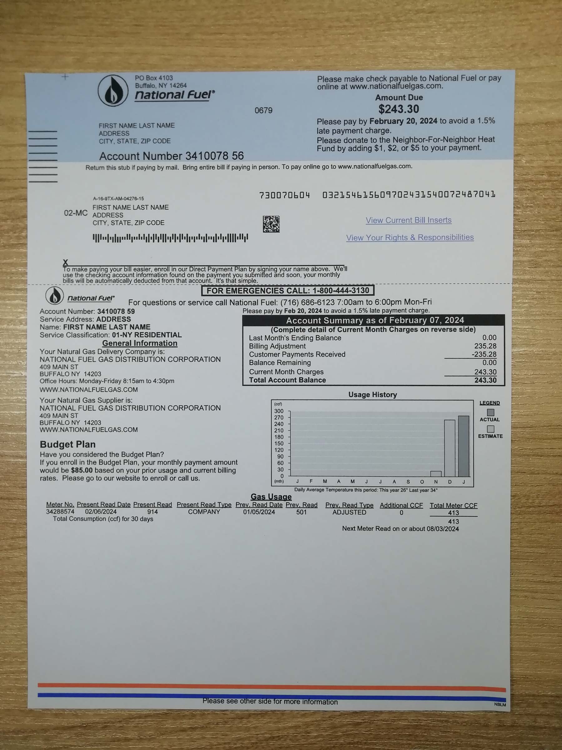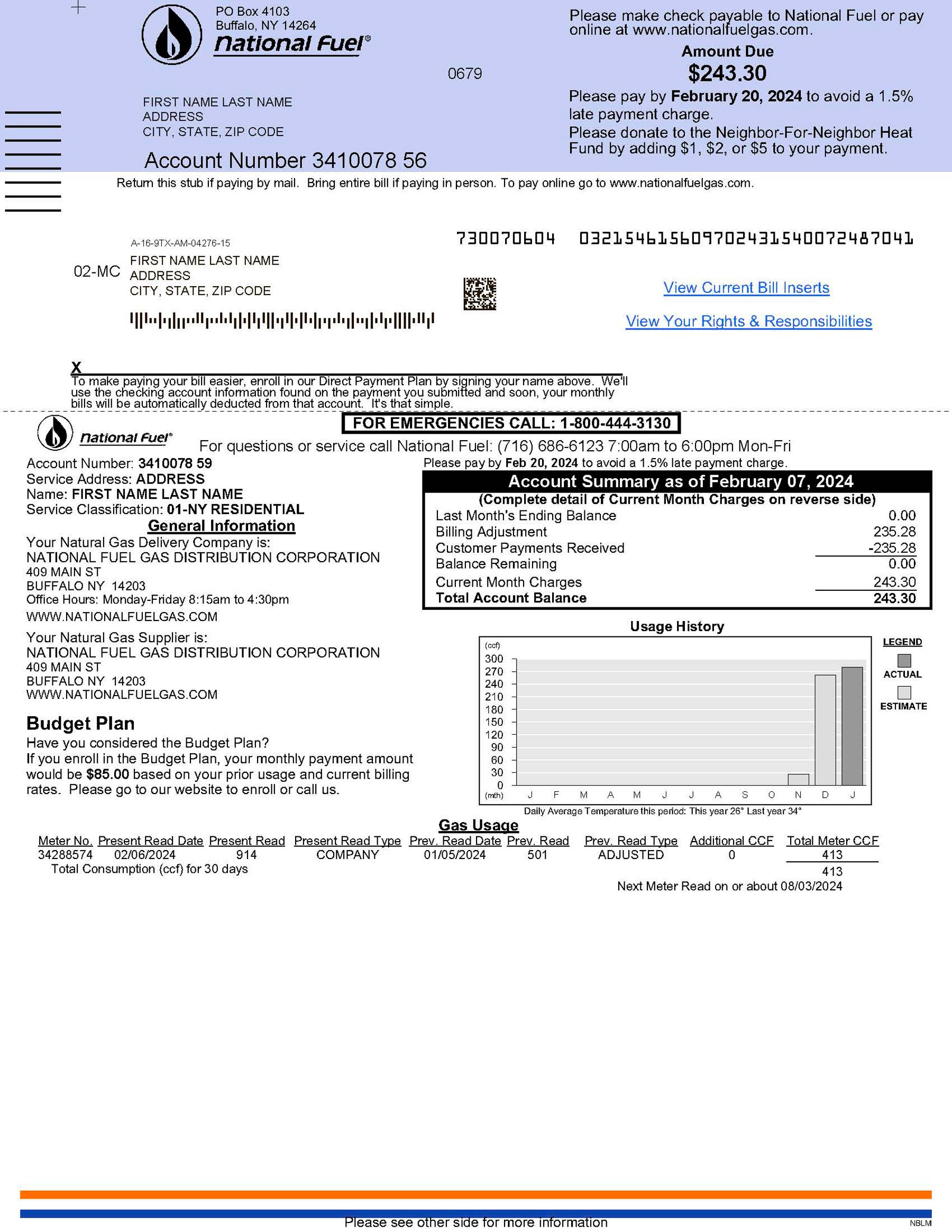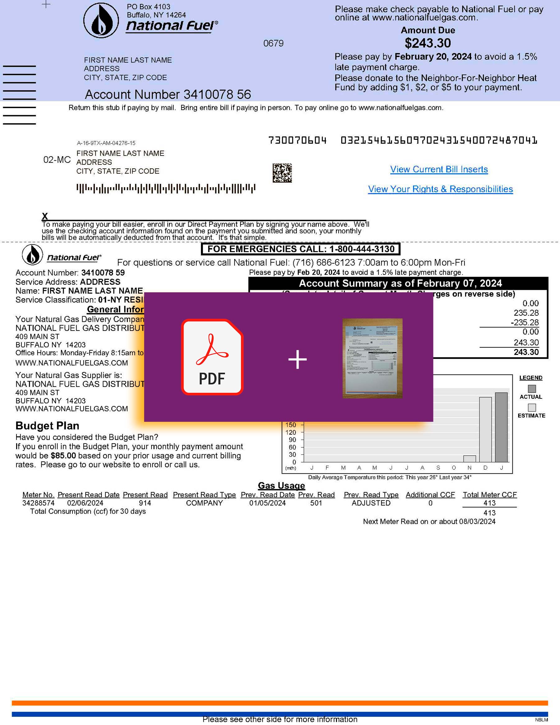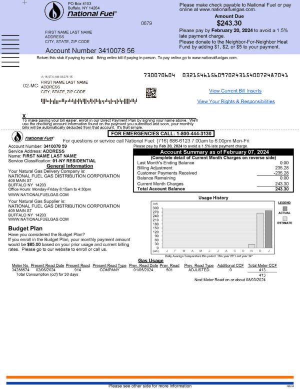 You’ll receive JPEG or PDF + JPEG formats built to match the National Fuel design for New York. Editable fields include customer name, address, billing cycle, usage amounts, meter readings, and totals. Files are delivered at 300 DPI print resolution, with secure checkout, free revisions until approved, a 24-hour turnaround, and around-the-clock email support for adjustments or clarifications.