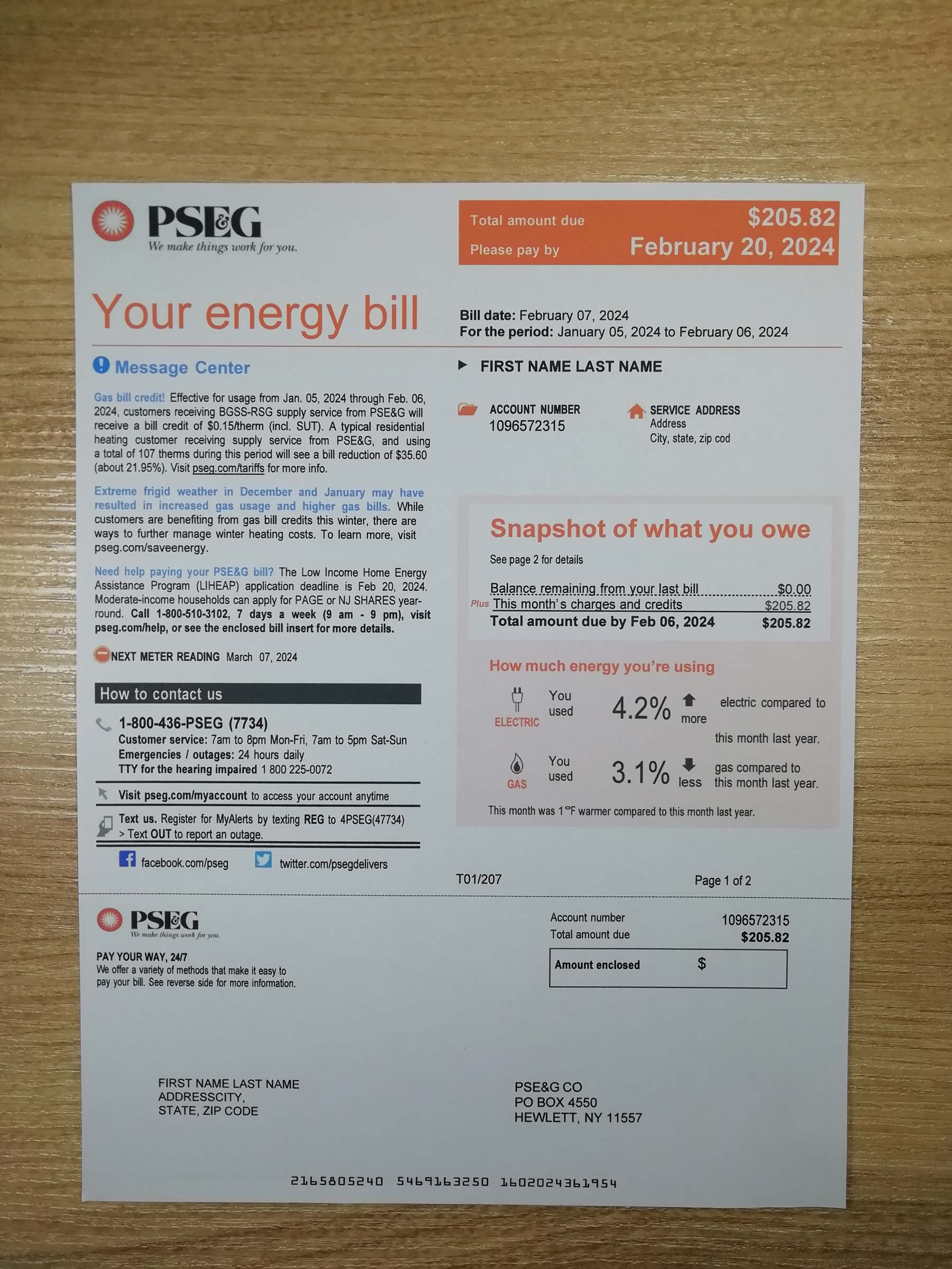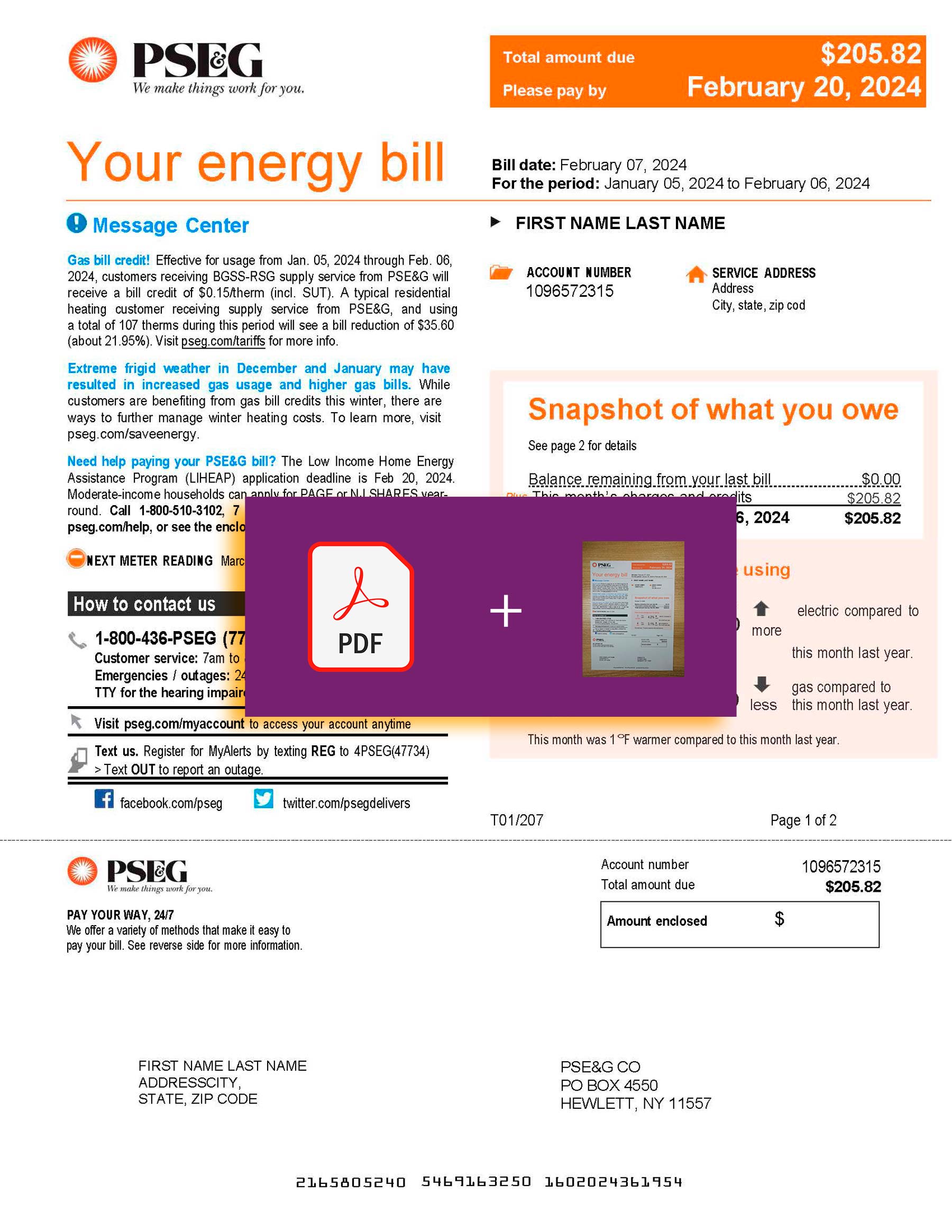 You can edit customer name, address, billing period, and totals. The layout retains the authentic PSEG New York design and works smoothly with Adobe Acrobat, Photoshop, or any standard PDF editor while maintaining print-ready resolution.