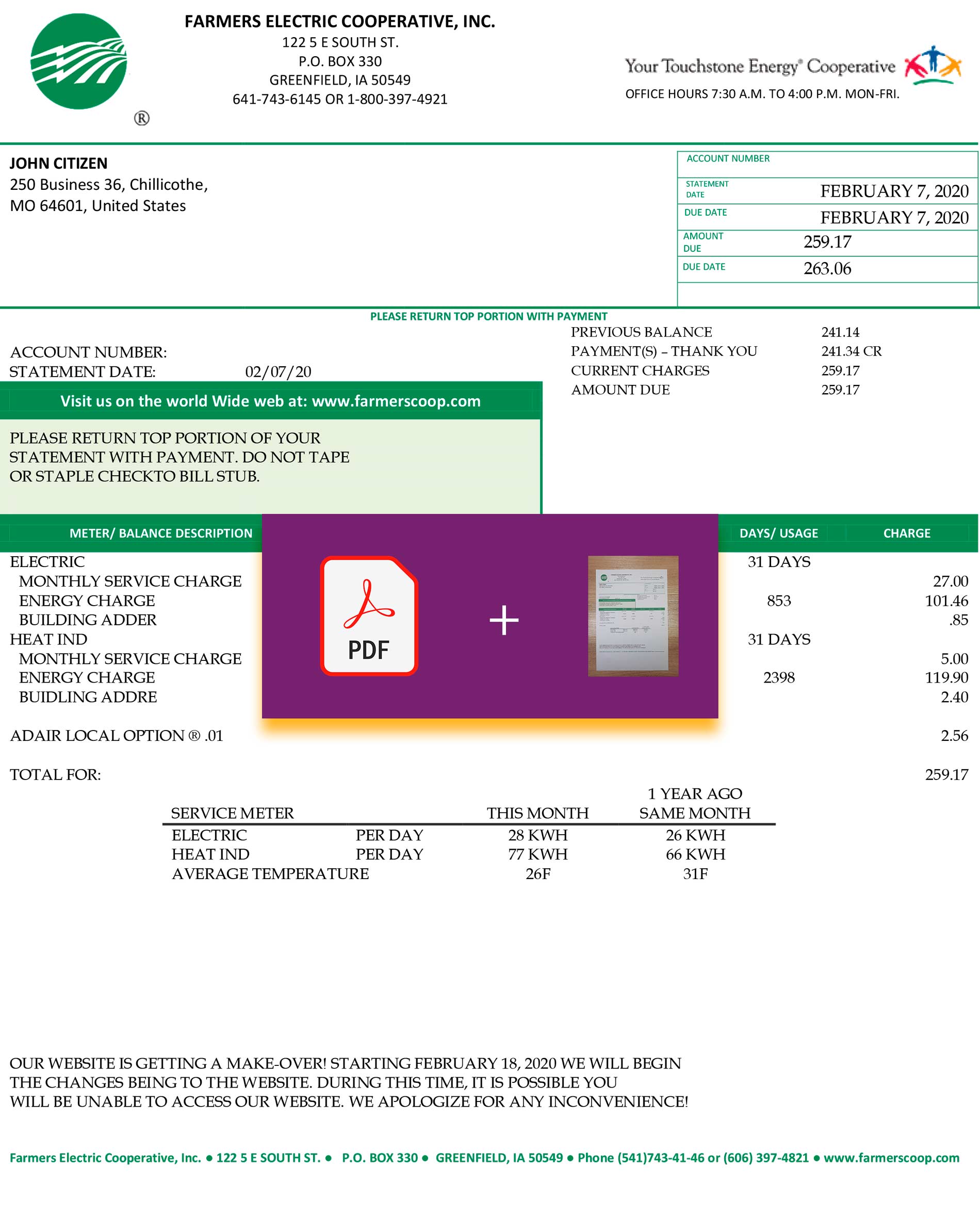 You’ll receive JPEG or PDF + JPEG versions, both in crisp 300 DPI resolution and aligned with Farmers Electric Cooperative’s Ohio layout. Editable areas include customer name, service address, billing cycle, account summary, and total due. Each order includes free revisions until you’re satisfied, 24-hour guaranteed turnaround, and 24/7 customer support. All templates are print-ready and optimized for professional use.