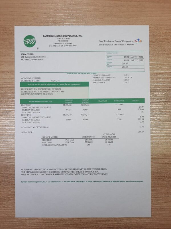 The Editable Farmers Electric Cooperative Utility Bill – 2025 Ohio Format is a high-quality, 300 DPI document modeled after real cooperative billing statements used across Ohio. Designed for proof-of-address (POA) verifications, UI/UX testing, and compliance training, this editable bill provides a professional layout and full customization options. Every field, from customer details to billing totals, can be adjusted while maintaining a true-to-format presentation. It’s a Done-For-You process — our team creates and delivers your customized file without requiring any manual editing on your part.