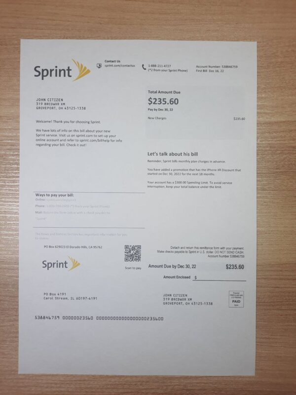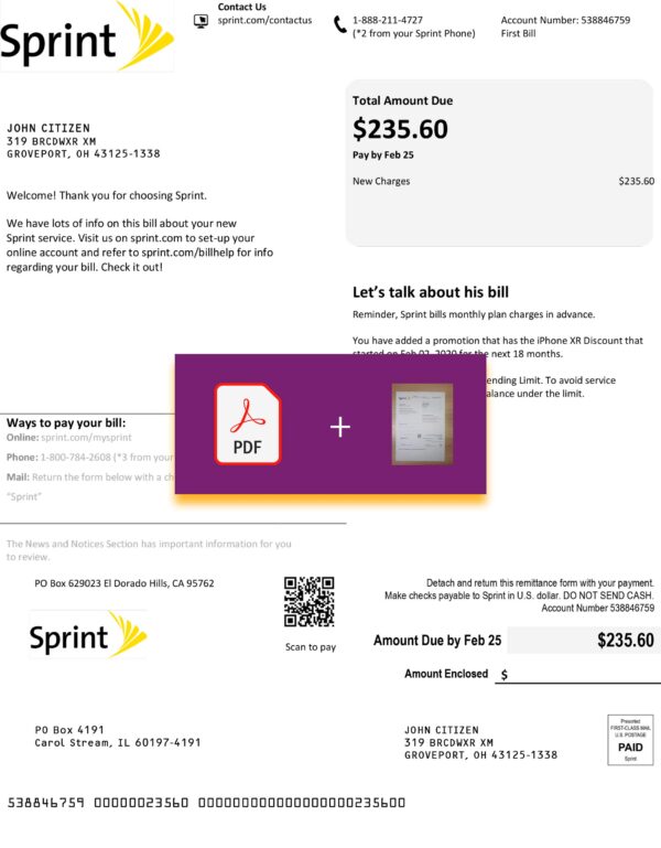 Your download includes JPEG or PDF + JPEG files in 300 DPI resolution, professionally aligned with Sprint’s Ohio telecom layout. Editable sections include customer details, statement period, usage breakdown, and total charges. Every order includes free revisions until approval, 24-hour guaranteed turnaround, secure checkout, and 24/7 customer support. Each file is optimized for print and digital presentation, ensuring professional visual quality.
