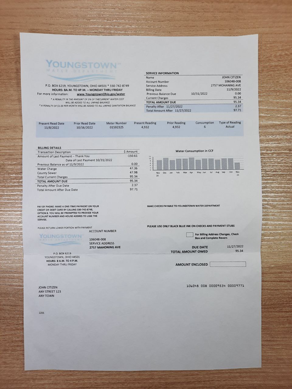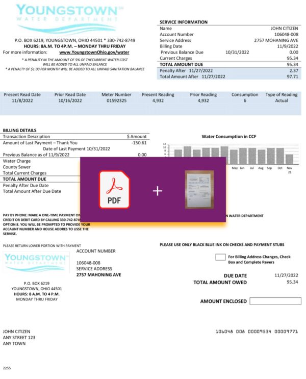 This package contains JPEG and PDF + JPEG formats with a consistent Youngstown Water Department layout aligned to Ohio standards. Editable fields include customer name, billing address, meter readings, service period, and total due. Each order includes free revisions until approval, a guaranteed 24-hour turnaround, secure checkout, and 24/7 professional support for a smooth customer experience.