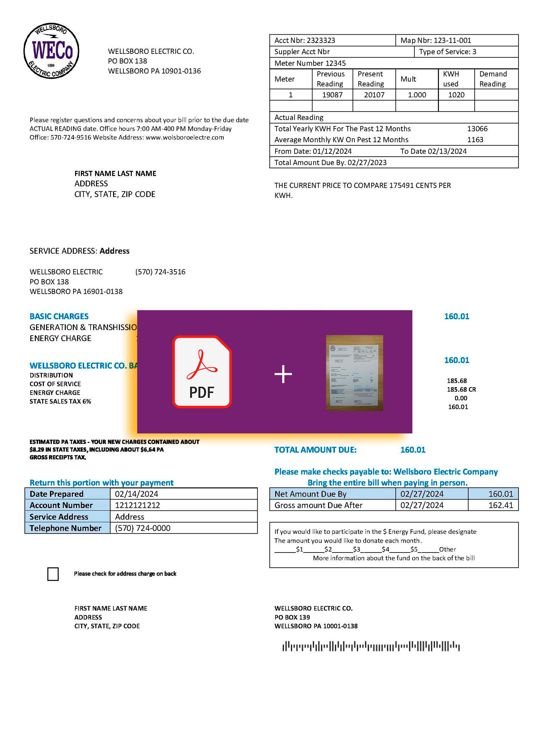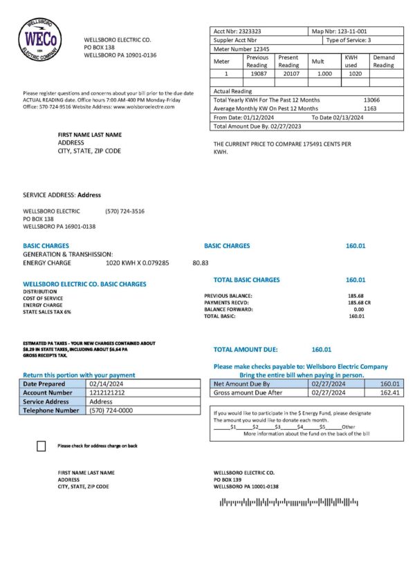 You’ll receive high-resolution files (JPEG or PDF + JPEG) at 300 DPI, fully editable to match the Wellsboro Electric design for Pennsylvania. Editable sections include name, service address, billing dates, meter readings, and total charges. Each order includes free revisions until approved, 24-hour turnaround, encrypted checkout for security, and 24/7 professional support for your convenience.
