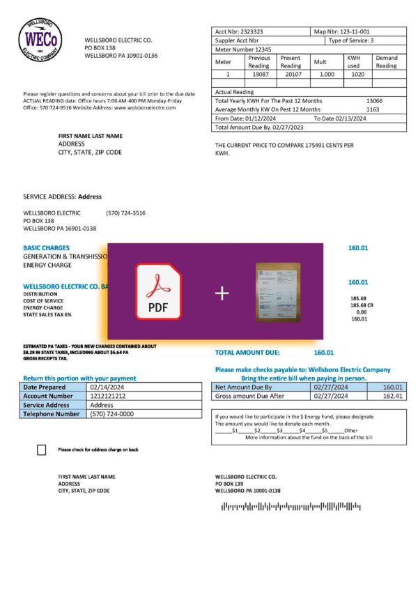 Your completed Wellsboro Electric bill arrives as a JPEG or PDF+JPEG file, ready for digital upload or print submission.