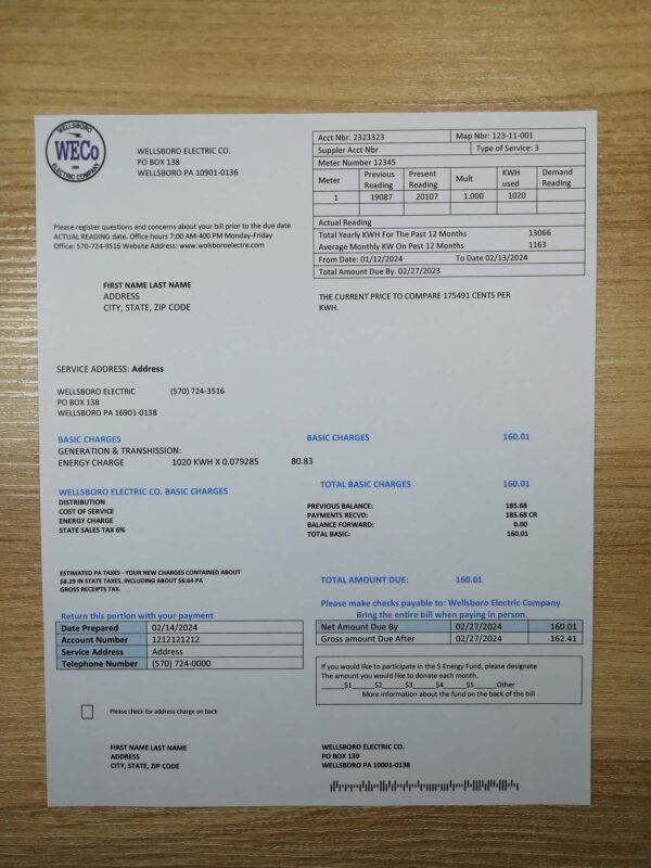 The bill is registered in your name at a real, active Wellsboro Electric service address within our Pennsylvania partner network. You can specify your preferred billing date range when submitting the order to ensure the statement period aligns with your proof of address requirements.