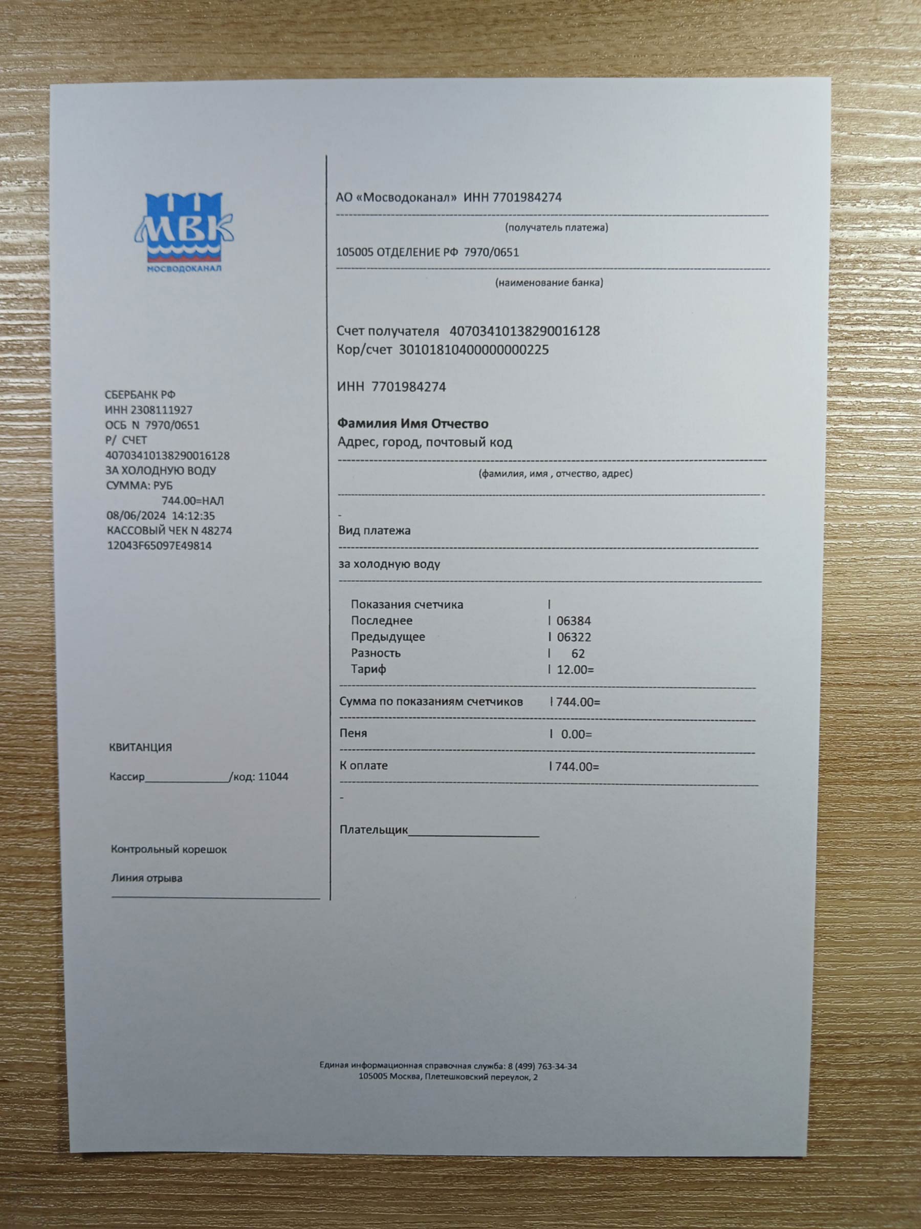 Editable components include customer details, billing cycle, usage volume, and total charges. The file is structured in a realistic Russian utility bill format and works seamlessly with Adobe Photoshop or PDF editing tools, retaining 300 DPI print quality.