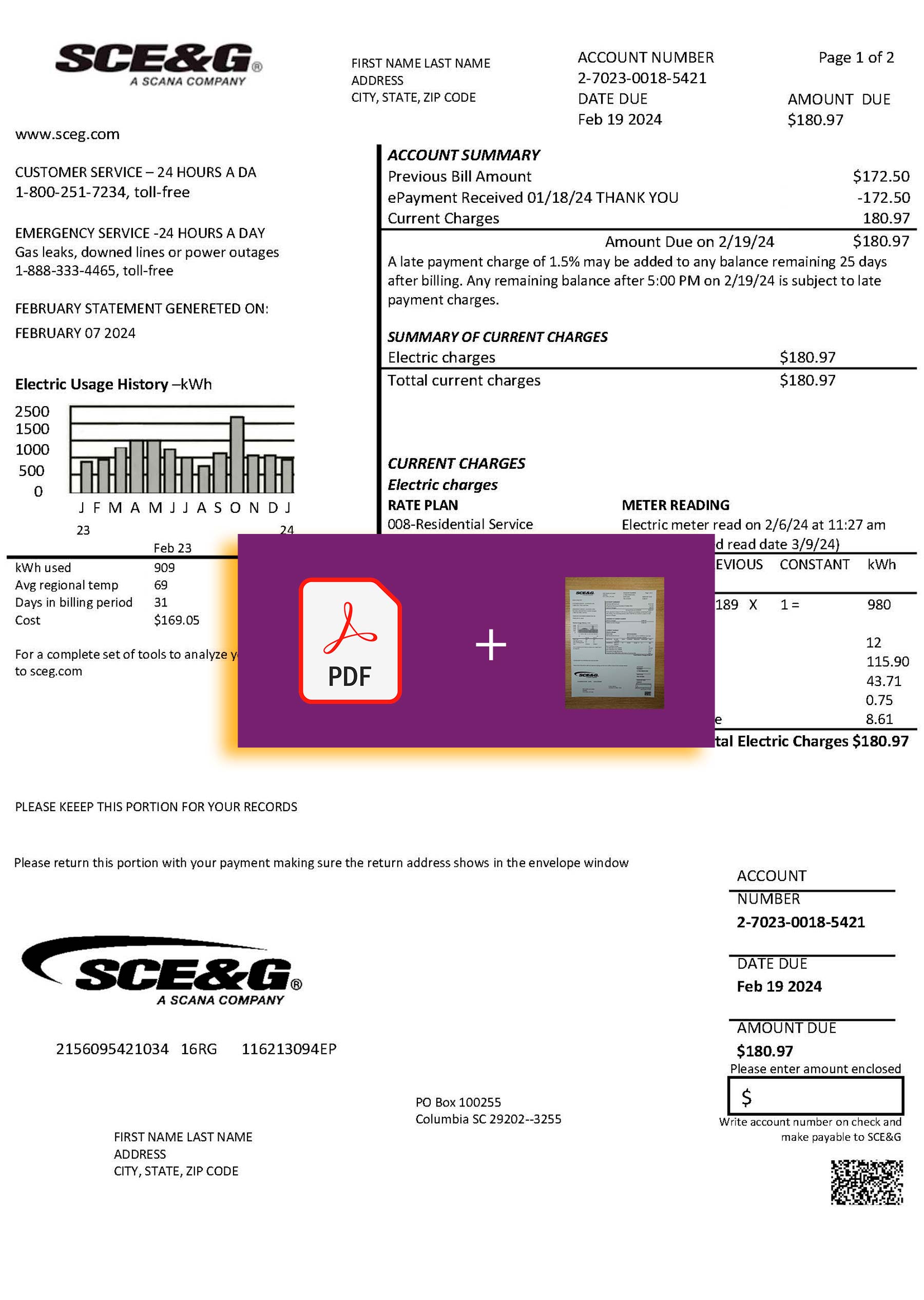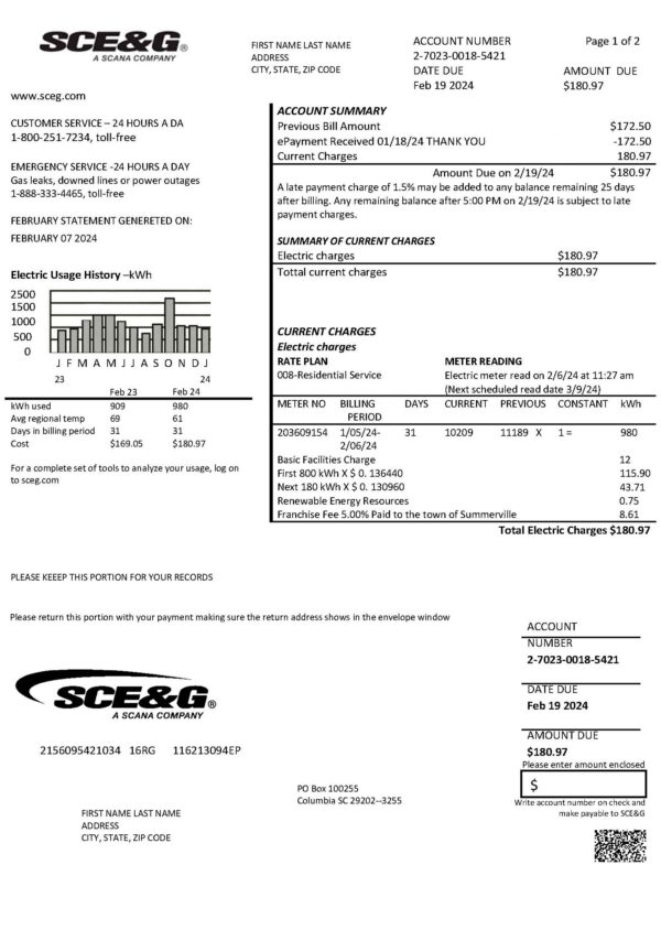 Your order includes both JPEG and PDF formats at full 300-DPI resolution. The design aligns with the authentic SCE&G electric and gas billing layout for South Carolina. Editable fields include customer name, account number, billing period, meter readings, usage, and total amounts. You’ll receive free revisions until approval, a guaranteed 24-hour turnaround, secure checkout, and 24/7 customer support for assistance.