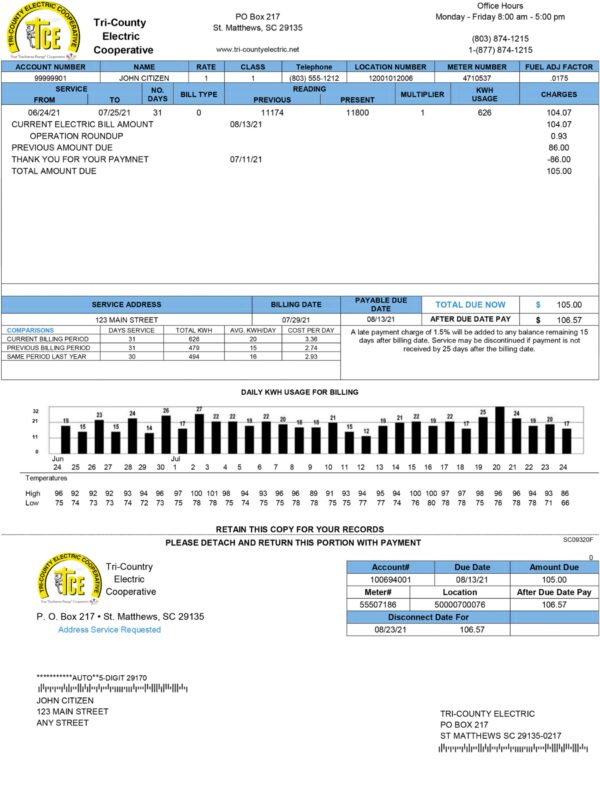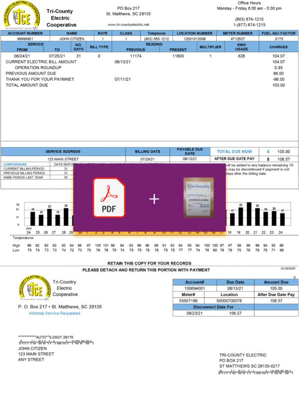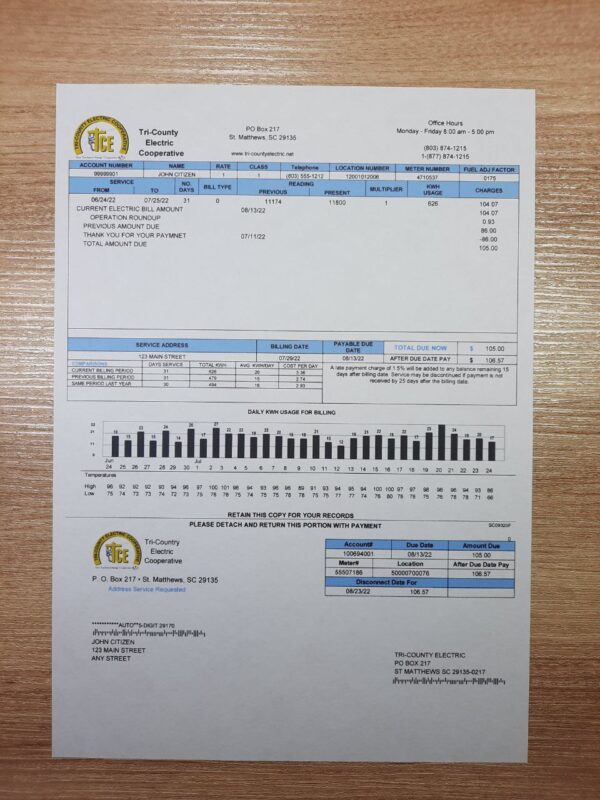 The Tri-County Electric Cooperative South Carolina template is known for its realistic visuals and editable design. You can also check out the SCE&G electricity layout or the Clean Water bill format to compare different proof-of-address templates from the same region.