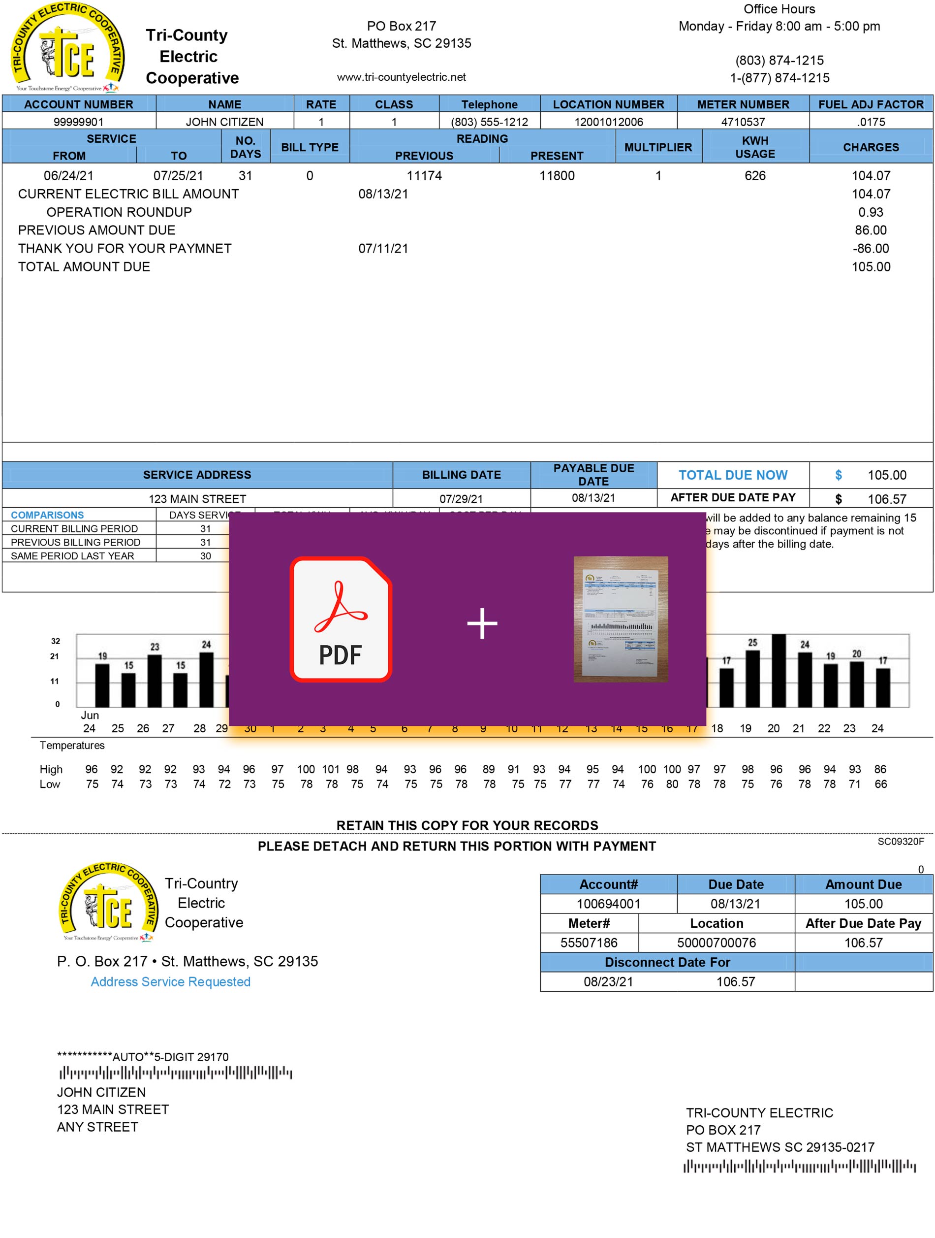 Your download includes JPEG or PDF + JPEG formats at 300 DPI resolution. The layout is fully aligned with the Tri-County Electric Cooperative South Carolina billing format. Editable fields include name, address, billing cycle, energy usage, and totals. You also receive free revisions until approved, guaranteed 24-hour turnaround, secure checkout, and 24/7 support for any adjustments or guidance needed.