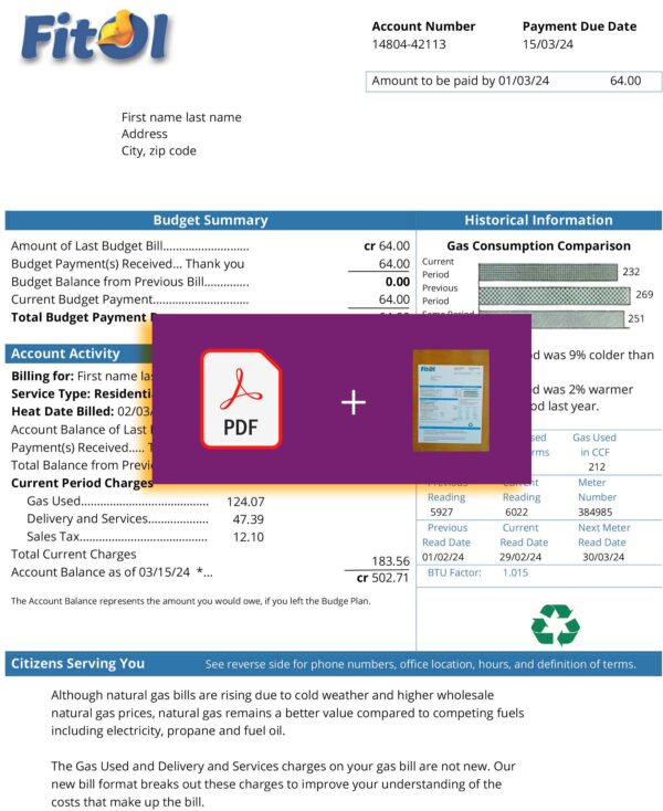 Your completed Swedish utility bill arrives as a JPEG or PDF+JPEG file, ready for digital upload or print submission.