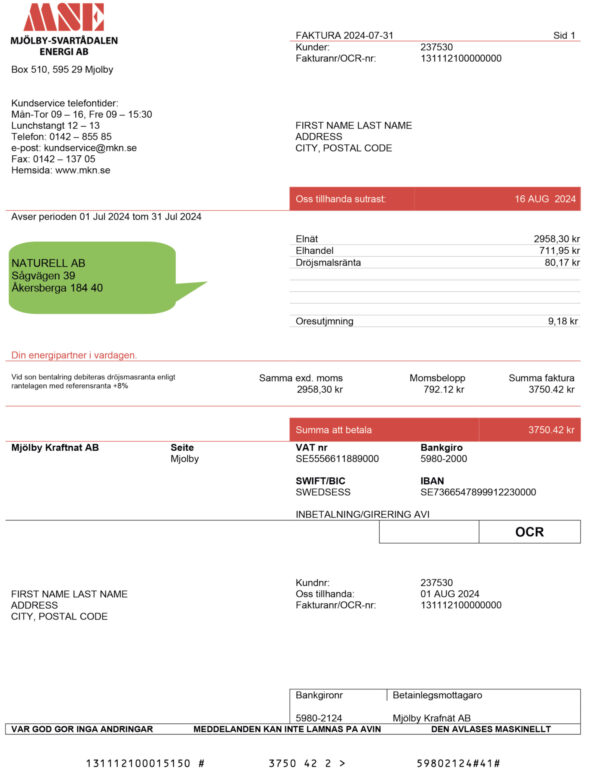 Your order includes JPEG or PDF + JPEG formats, both in 300 DPI print-ready quality. The layout mirrors the MSE Energi Sweden format with editable fields for customer name, service address, usage data, billing cycle, and totals. You’ll also receive free revisions until final approval, secure online checkout, 24-hour turnaround, and continuous support for updates or refinements.