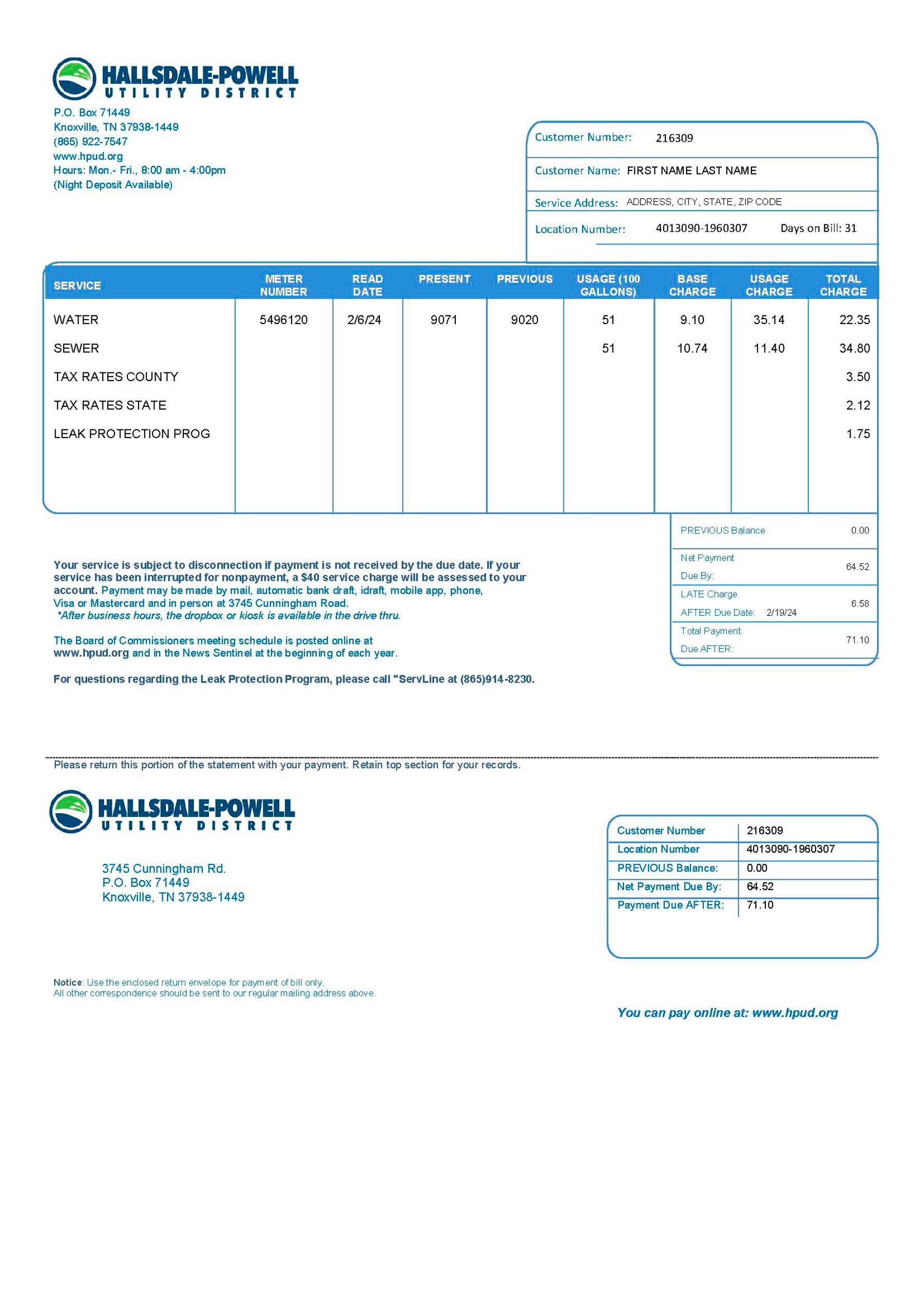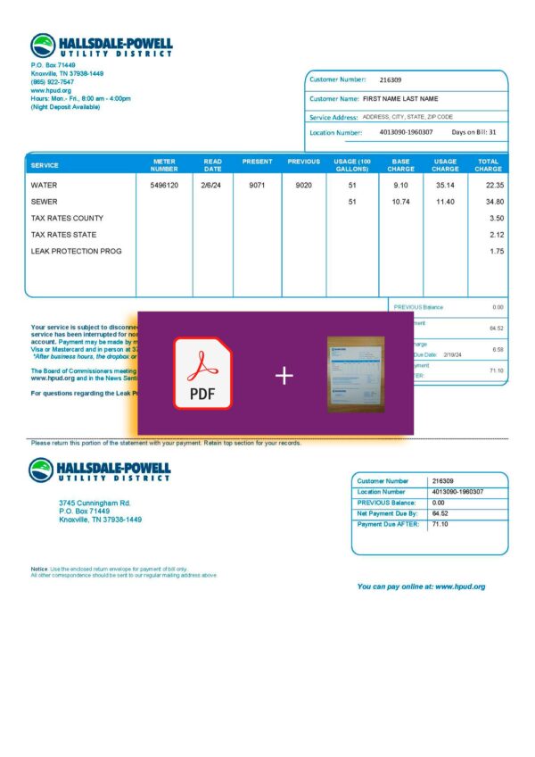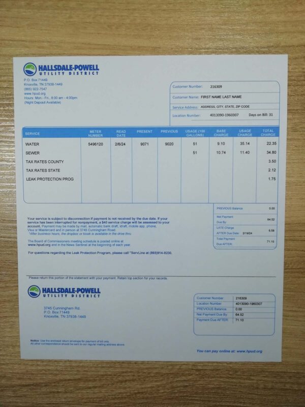 This package includes JPEG or PDF + JPEG formats, built in high-resolution 300 DPI for both digital and print use. The layout is aligned with Hallsdale-Powell’s Tennessee-based format, featuring editable name, service address, usage, and payment breakdowns. Orders include free revisions until approval, secure checkout, 24-hour turnaround, and round-the-clock support for full confidence and convenience.
