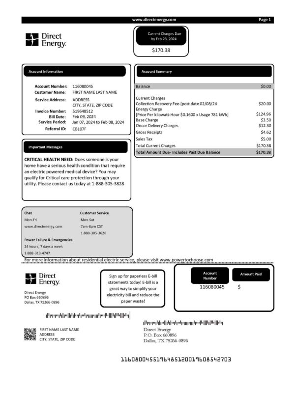 The Direct Energy Texas template features editable fields and a detailed design tailored for address validation. Customers also compare it with the Green Mountain Energy bill or the Cirro Energy statement for layout variety.