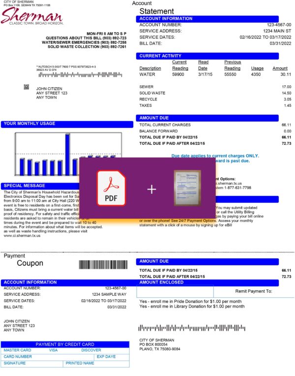 The Sherman Texas utility bill mock-up replicates an authentic layout, perfect for editable visual or training purposes. You might also check out the Blue Energy format or the Tyler Technologies template for comparable 2025-ready files.