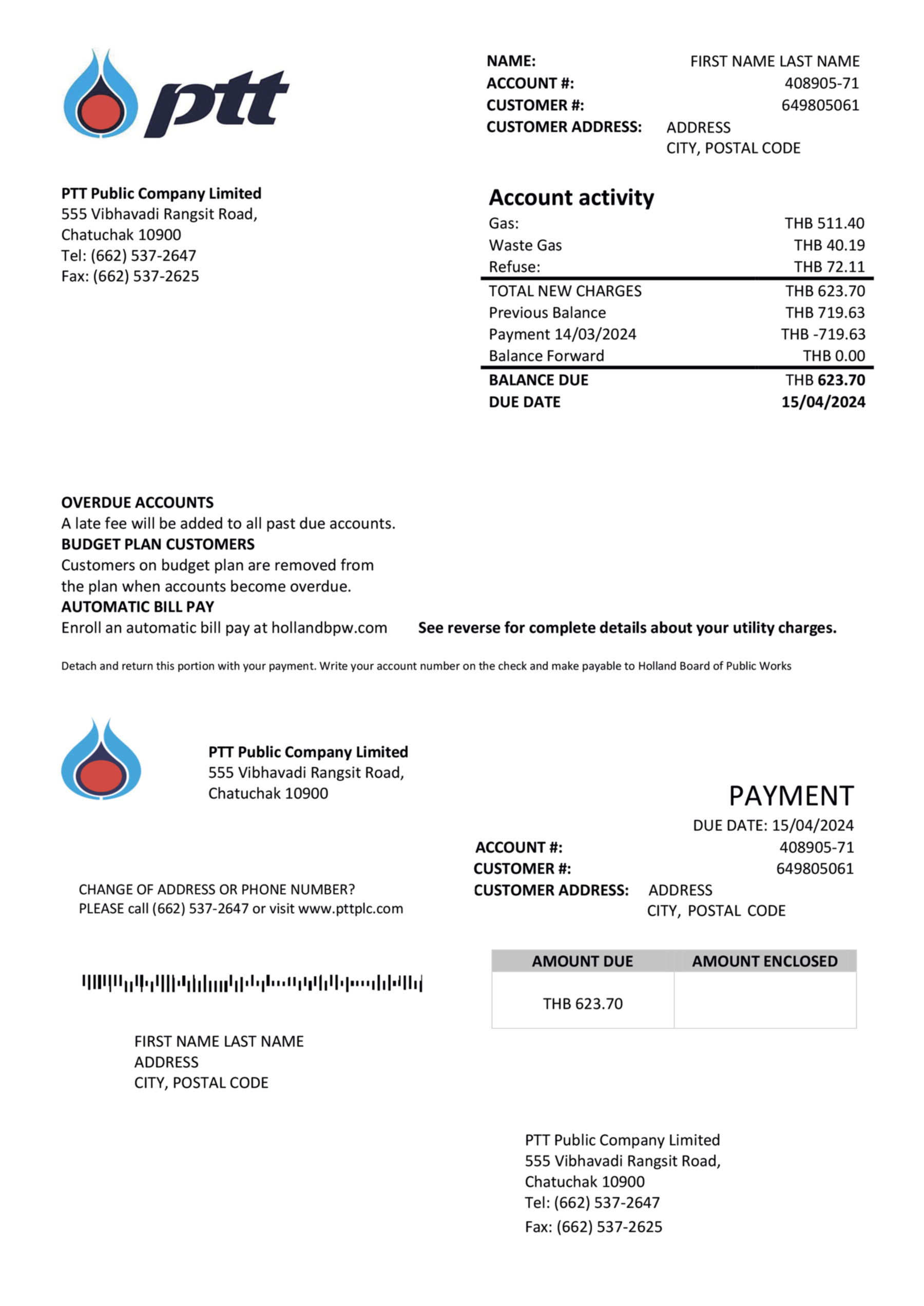 Included formats: JPEG or PDF + JPEG. The layout follows the PTT billing standard used in Thailand and includes editable fields such as name, address, billing cycle, usage units, and payable totals. Each order features free revisions until final approval, 24-hour turnaround, 300-DPI quality, encrypted checkout, and dedicated 24/7 support to ensure a smooth workflow from start to finish.