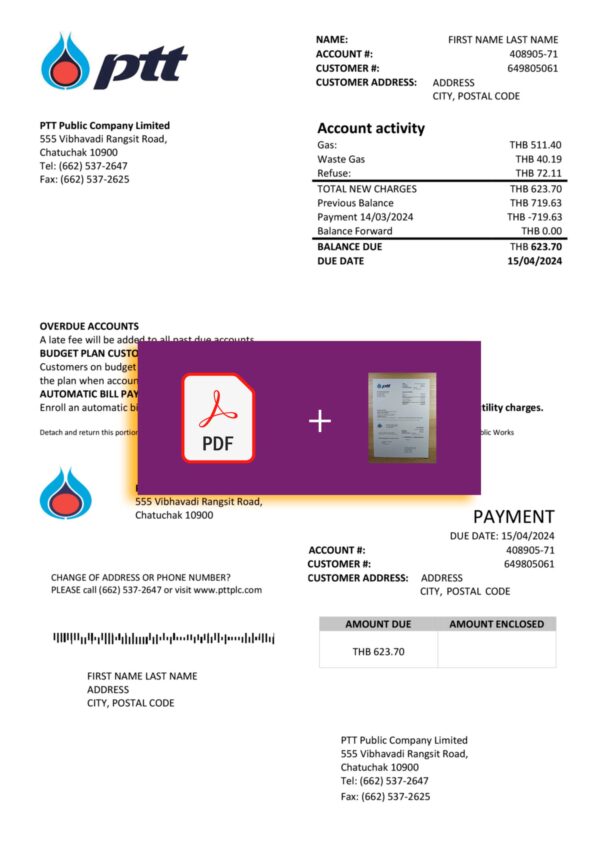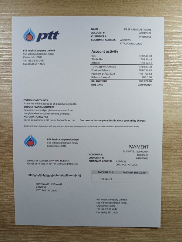 Included formats: JPEG or PDF + JPEG. The layout follows the PTT billing standard used in Thailand and includes editable fields such as name, address, billing cycle, usage units, and payable totals. Each order features free revisions until final approval, 24-hour turnaround, 300-DPI quality, encrypted checkout, and dedicated 24/7 support to ensure a smooth workflow from start to finish.