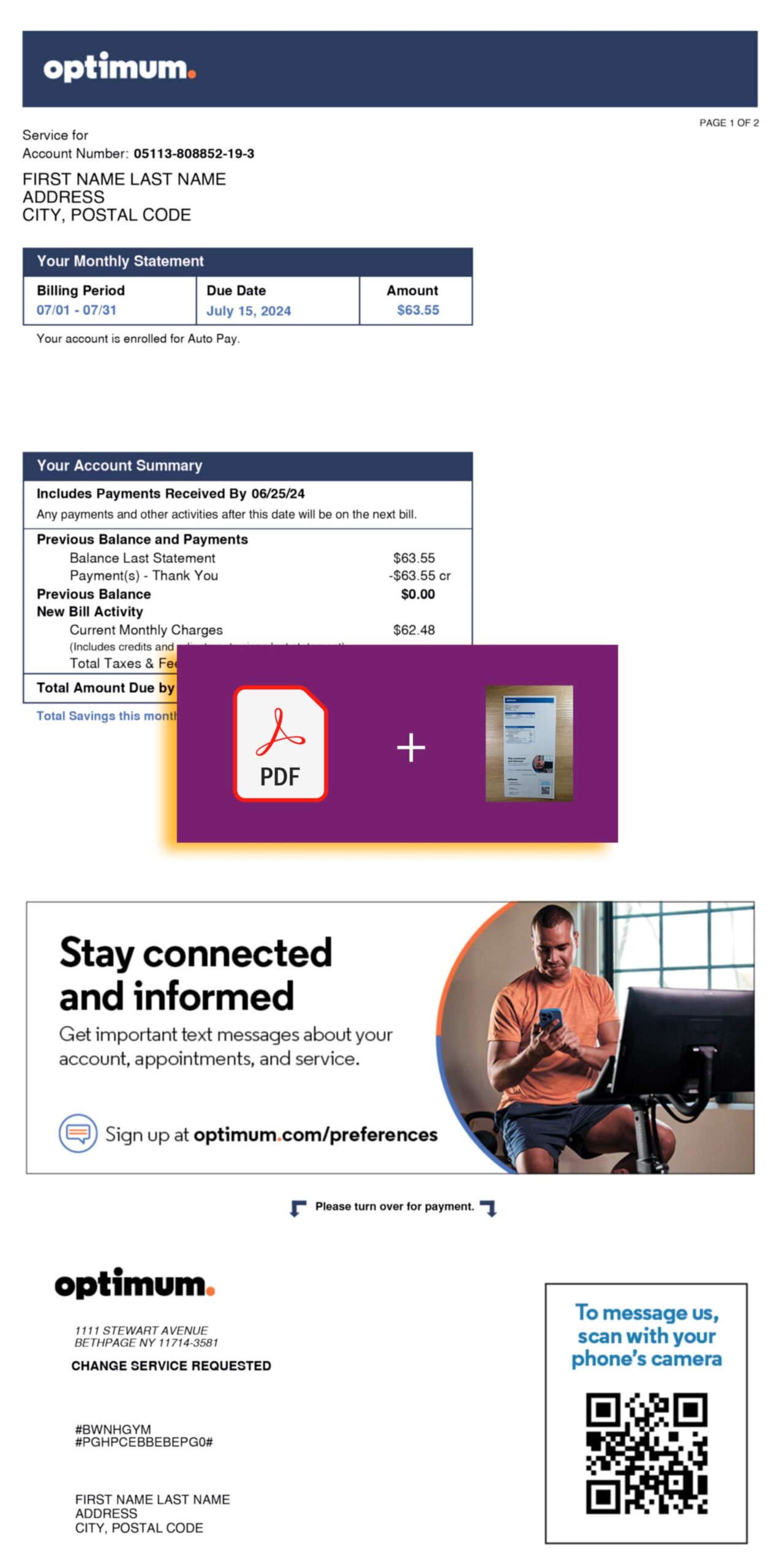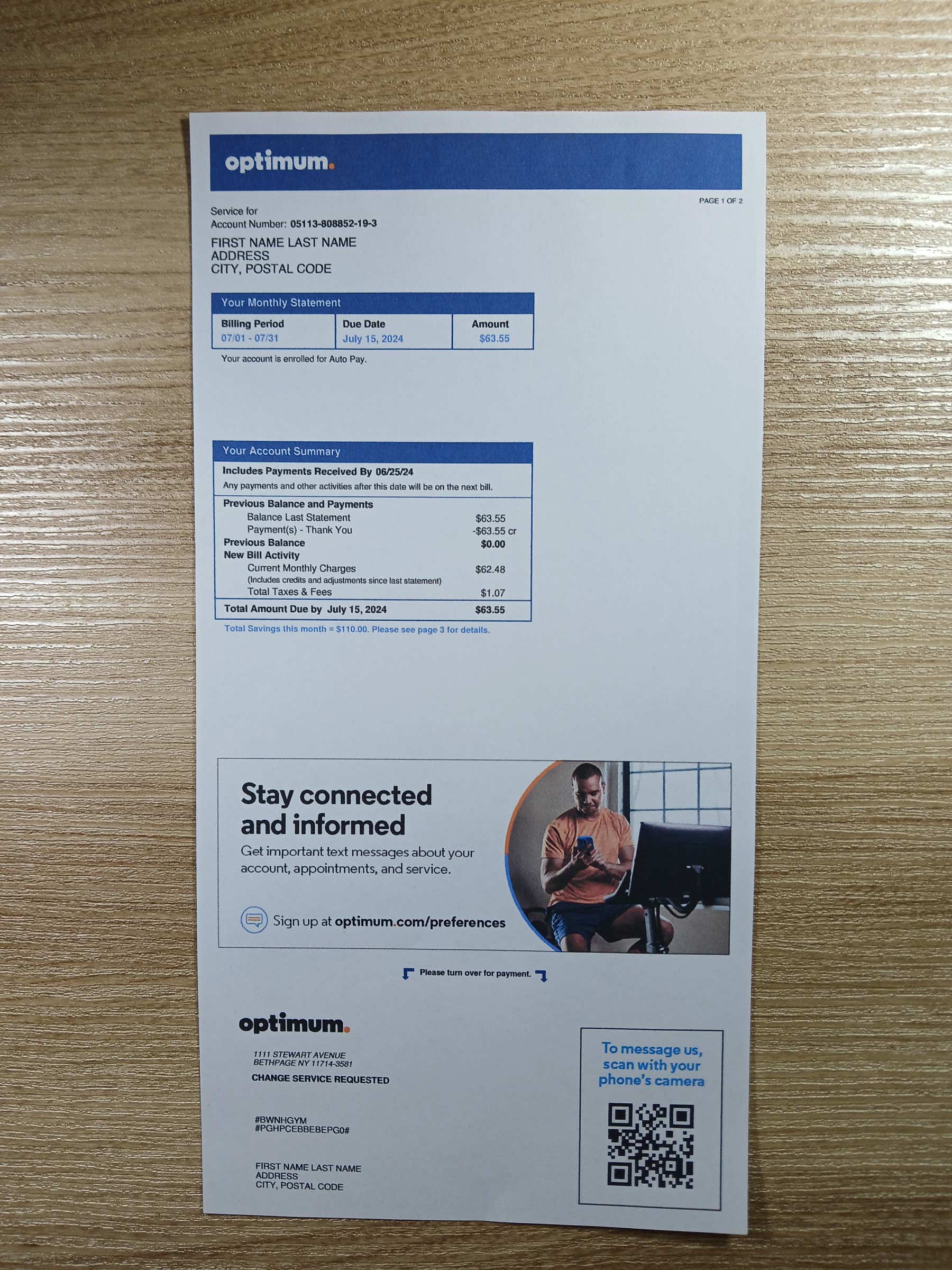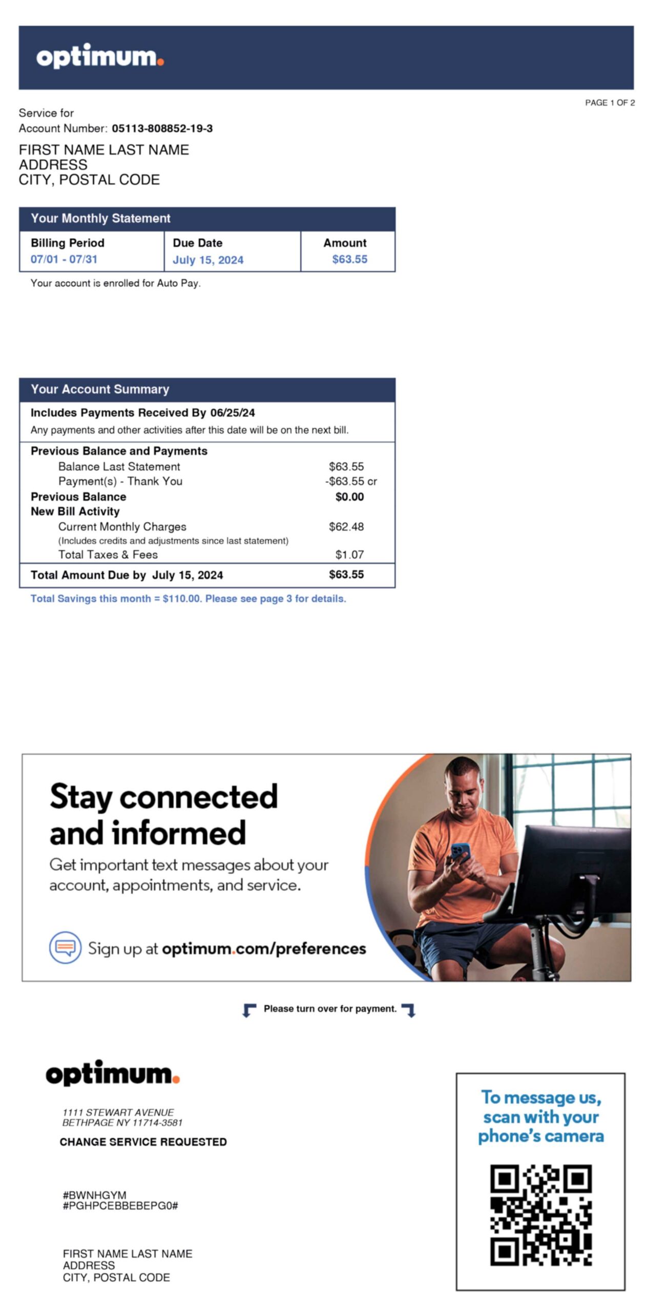 You’ll receive JPEG or PDF + JPEG formats at full 300 DPI, aligned with Optimum’s USA-style layout. Editable sections include customer name, service address, billing cycle, account ID, usage information, and total balance. The package includes free revisions until approval, guaranteed 24-hour turnaround, encrypted checkout, and responsive 24/7 support.