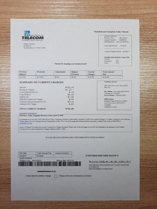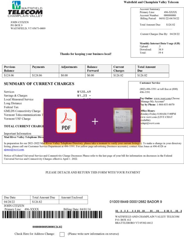 Your download includes JPEG or PDF + JPEG versions of the Waitsfield Telecom layout, adapted for Vermont. Each file contains editable elements such as customer name, account number, service address, billing period, and amount due. Every file is crafted in 300 DPI for print and digital clarity. You’ll receive free revisions until approval, guaranteed 24-hour turnaround, secure payment processing, and dedicated 24/7 customer support for your order.