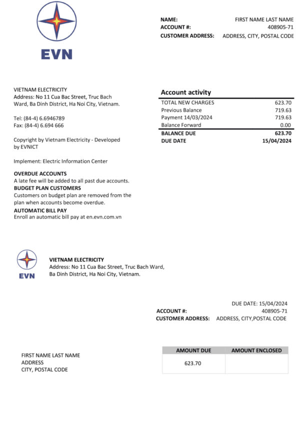 This file is suitable for all types of verifications. For example: for sites like paypal, payoner, paxful, binance, bets and poker web sites This Vietnam EVN utility bill template can be used for: