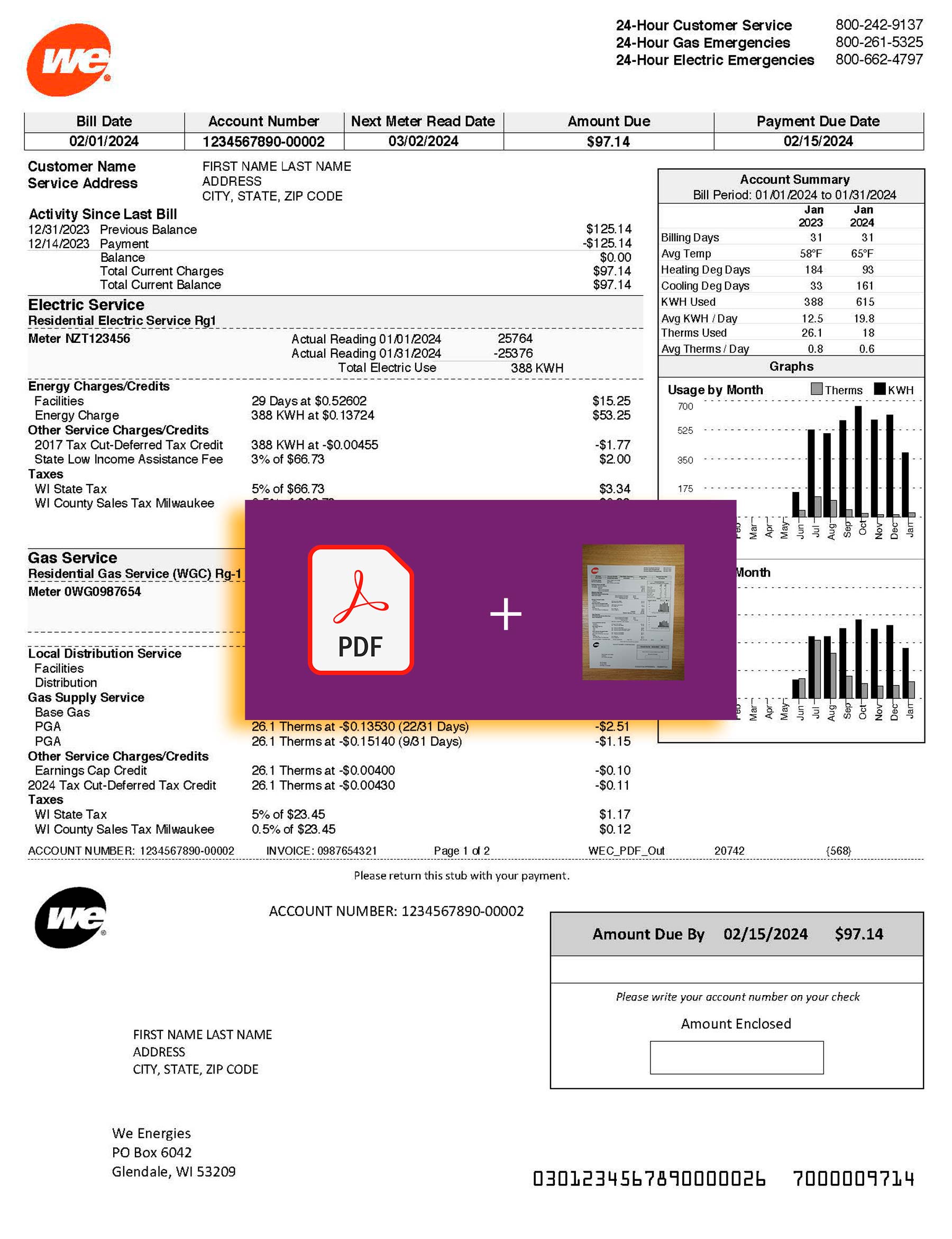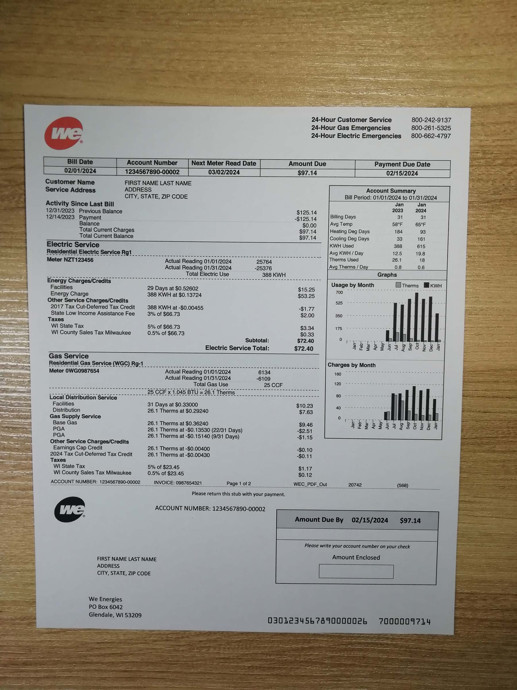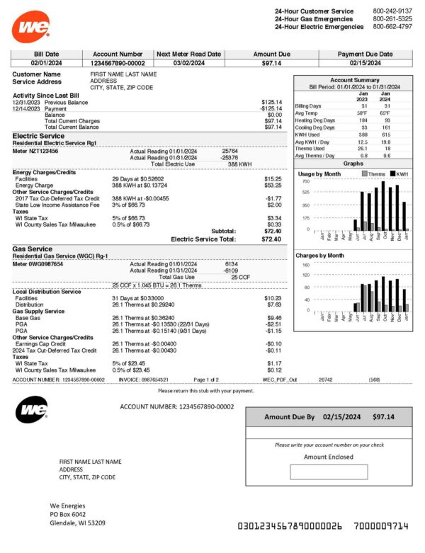 Delivered in JPEG or PDF + JPEG formats, each file matches the Wisconsin-specific We Energies layout. Editable sections include customer name, service address, billing cycle, usage metrics, and payment totals. You’ll receive free revisions until approval, 24-hour turnaround, and full customer support. Every order goes through encrypted checkout and includes 24/7 assistance to ensure quality and confidentiality.