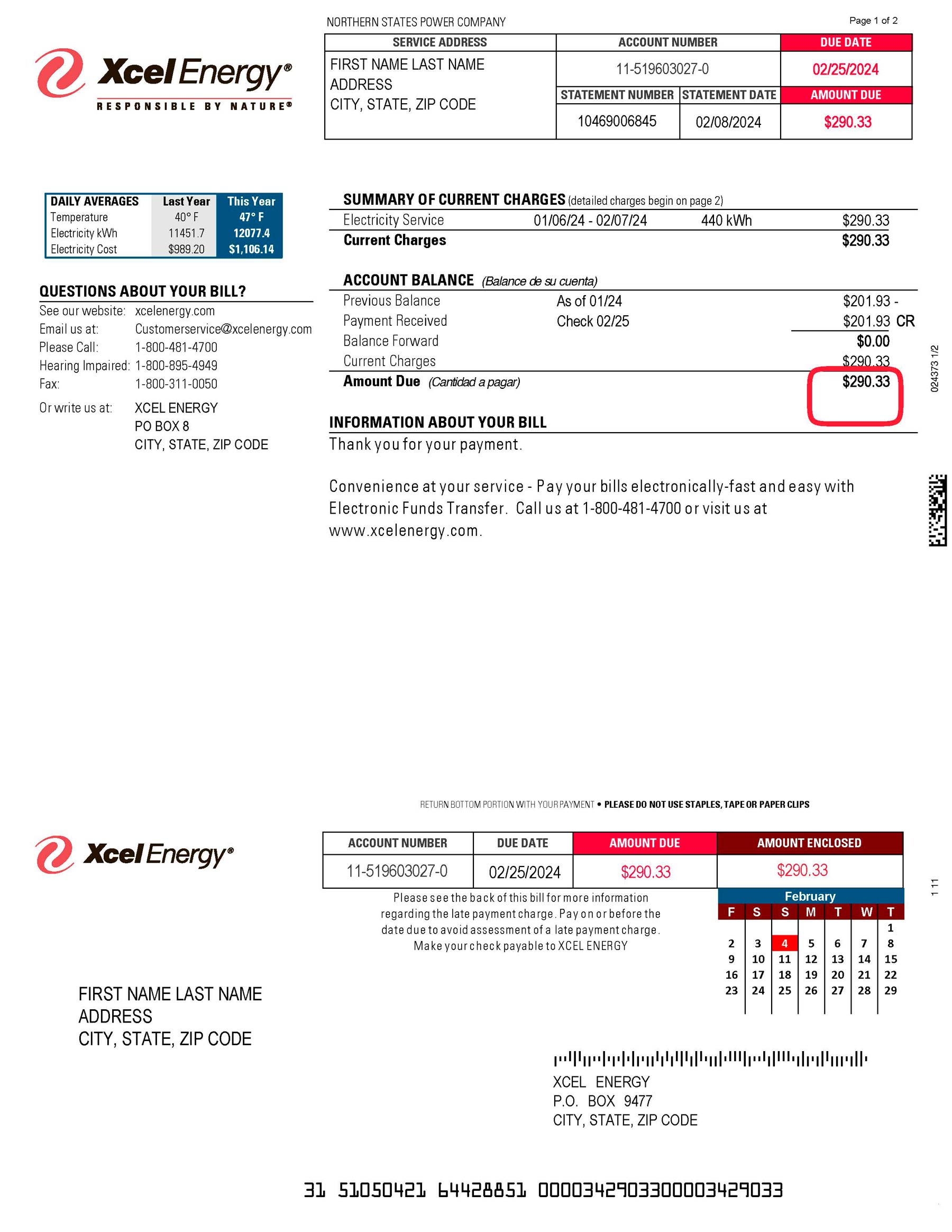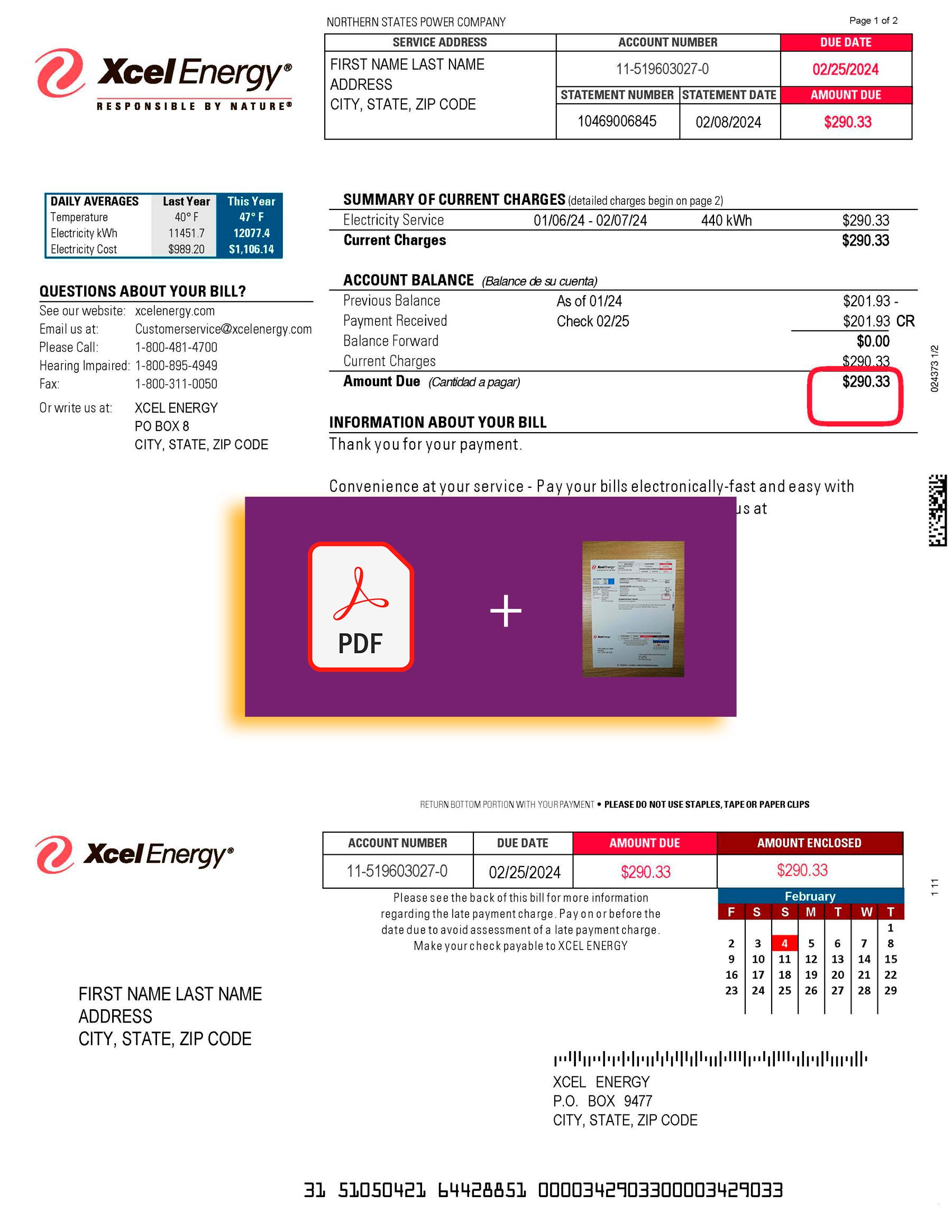 Included formats: JPEG or PDF + JPEG. Each file matches the structure of genuine Xcel Energy layouts in Wisconsin, featuring editable sections for customer name, service address, account number, billing period, energy usage, and totals. Every order includes free revisions until approval, delivery within 24 hours, secure checkout, and 24/7 customer assistance.