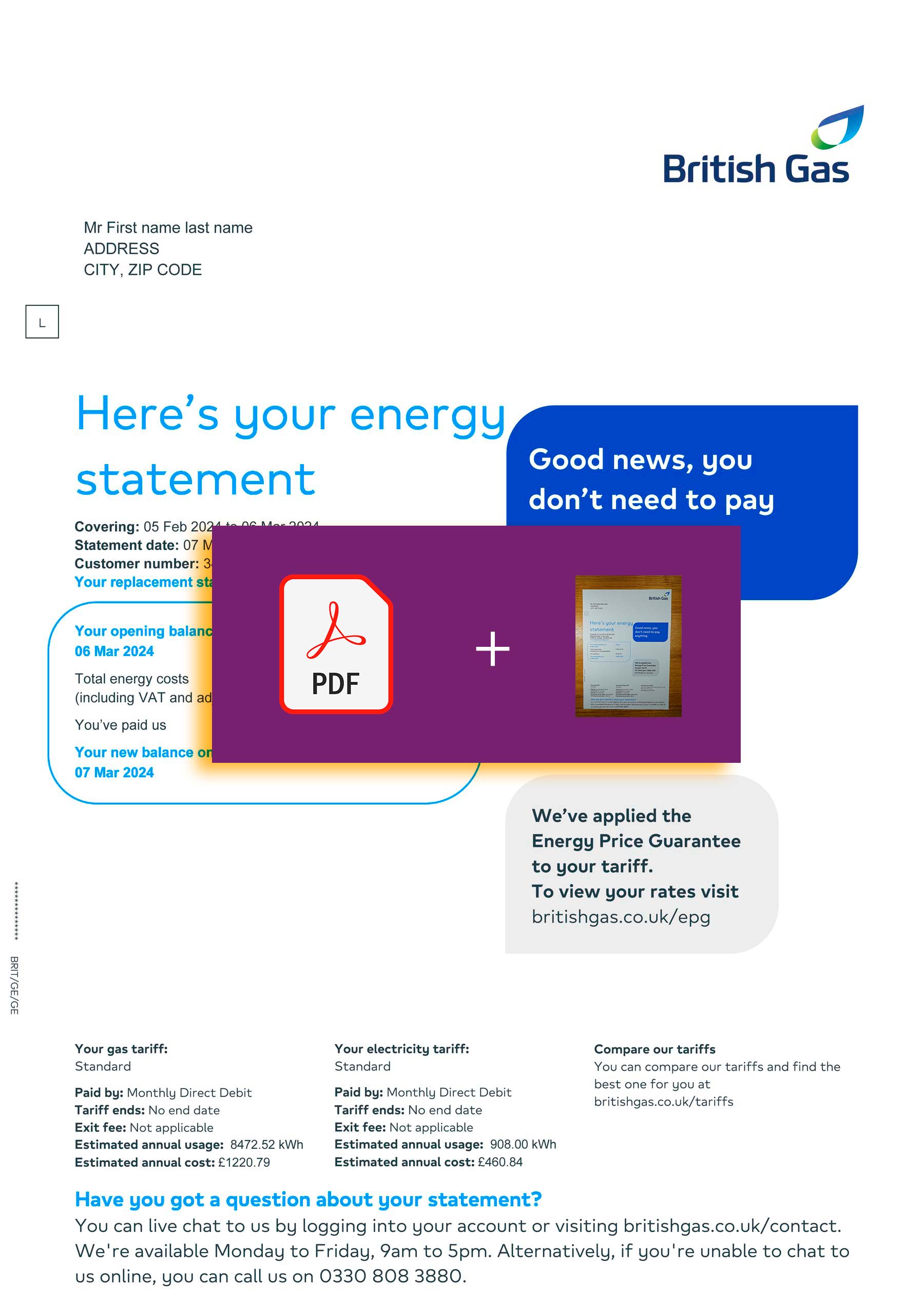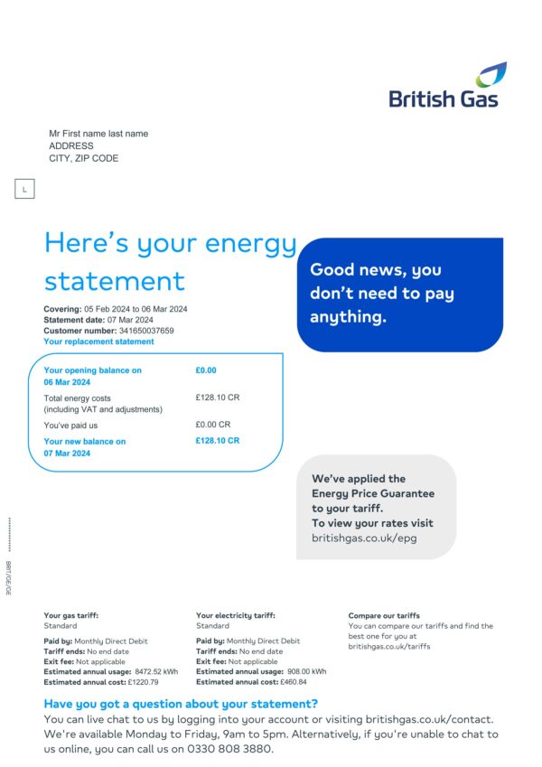 You’ll receive high-resolution files (300 DPI) aligned with British Gas’ authentic UK layout. Editable fields include the account holder’s name, service address, billing cycle, gas usage, and total due amount. Each order comes with free revisions until approved, fast turnaround (usually within 24 hours), secure checkout, and 24/7 customer support to ensure a seamless experience.