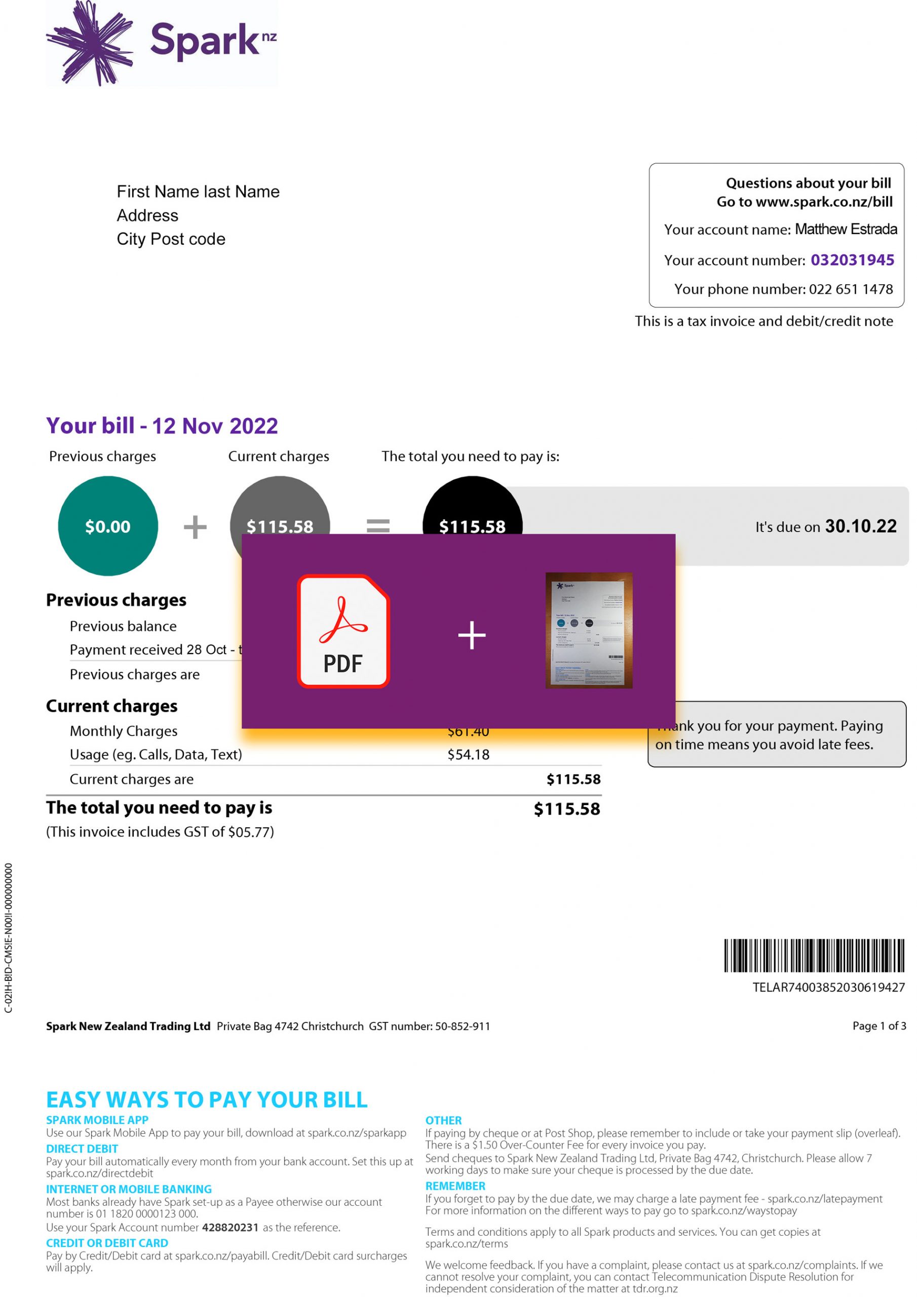 Your completed utility bill arrives as a JPEG or PDF+JPEG file, ready for digital upload or print submission.