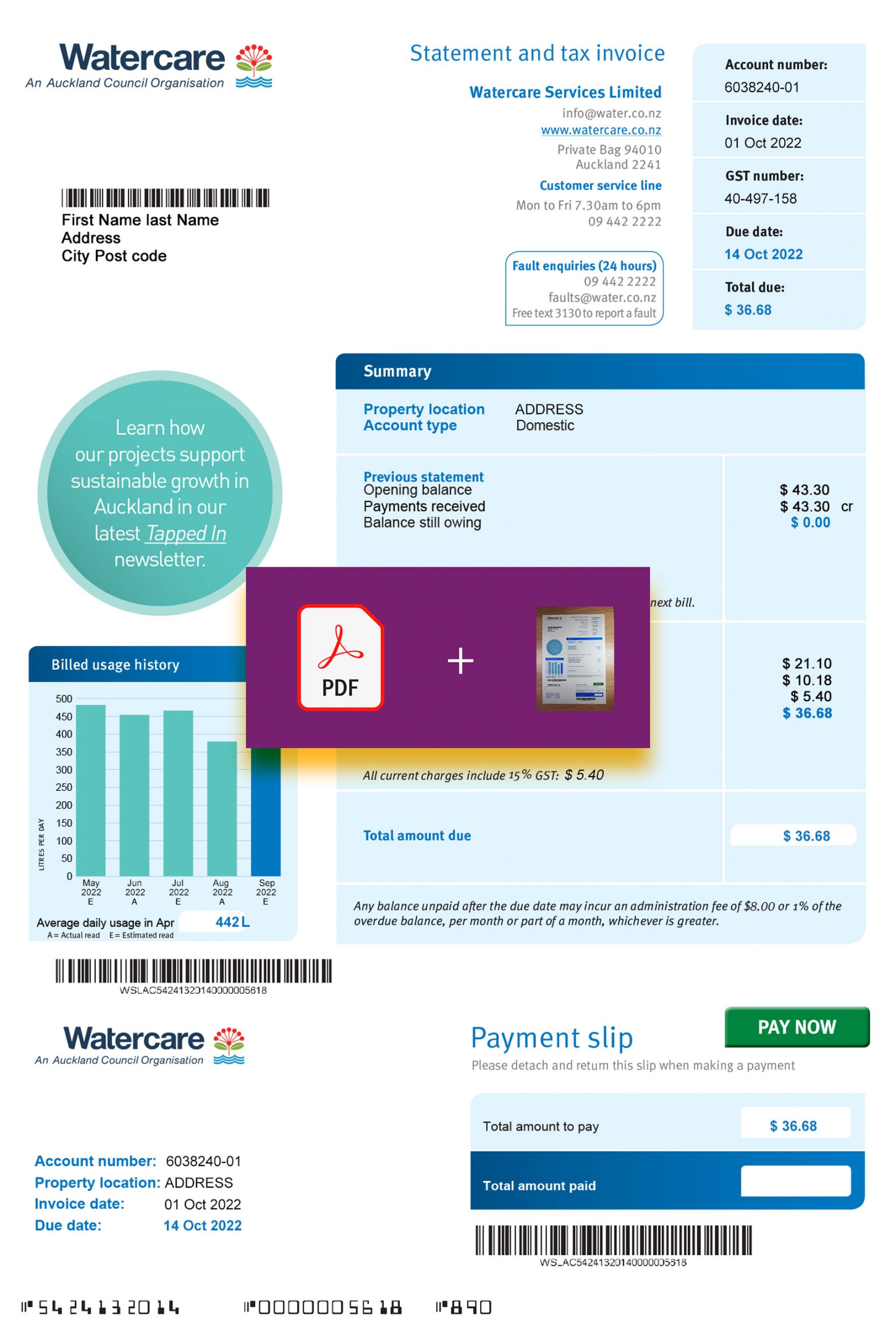 Your completed utility bill arrives as a JPEG or PDF+JPEG file, ready for digital upload or print submission.
