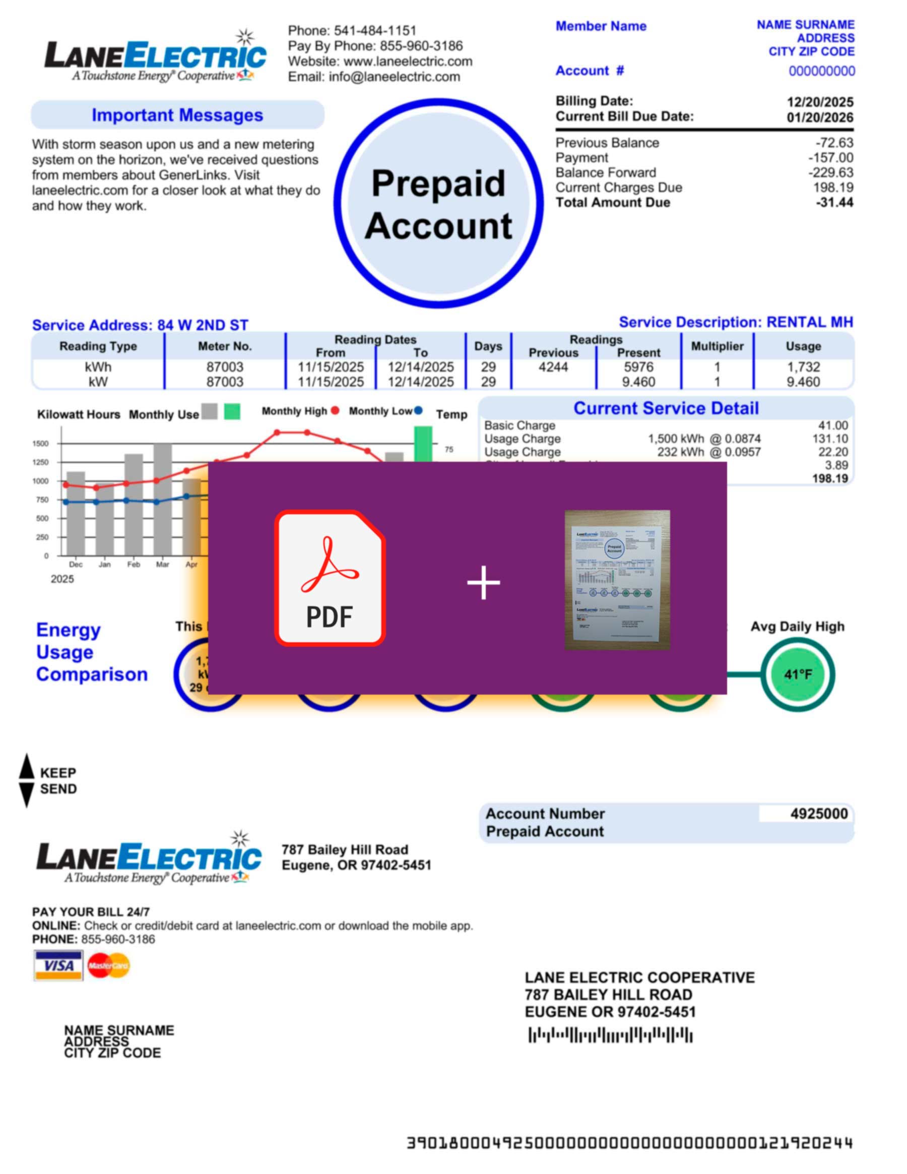 The package includes JPEG or PDF + JPEG formats, perfectly aligned with Lane Electric’s official layout as used in Oregon. Editable areas include customer name, service address, billing cycle, energy usage, and total charges. You receive free revisions until approval, delivery within 24 hours, secure checkout, and 24/7 client support to ensure an easy and professional experience from order to completion.