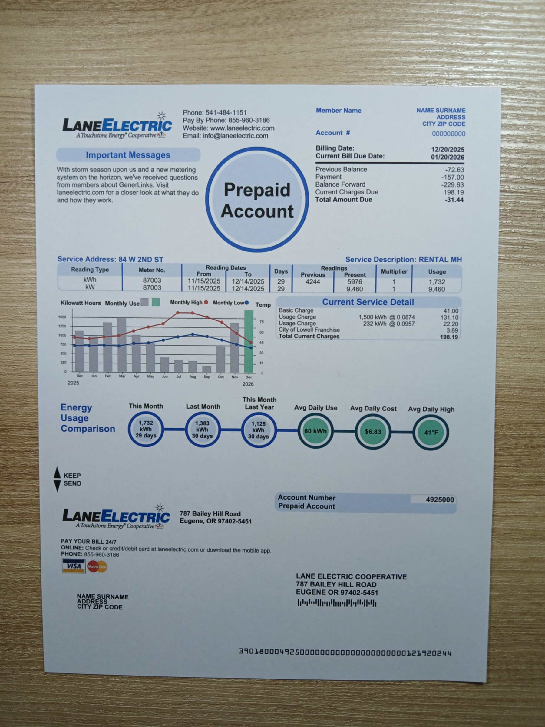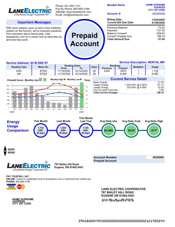 This Lane Electric Oregon template provides a true-to-life design, great for UX and address proof demos. Visitors also explore the Green Mountain Energy layout or the Oregon PGE bill version for consistency across utilities.
