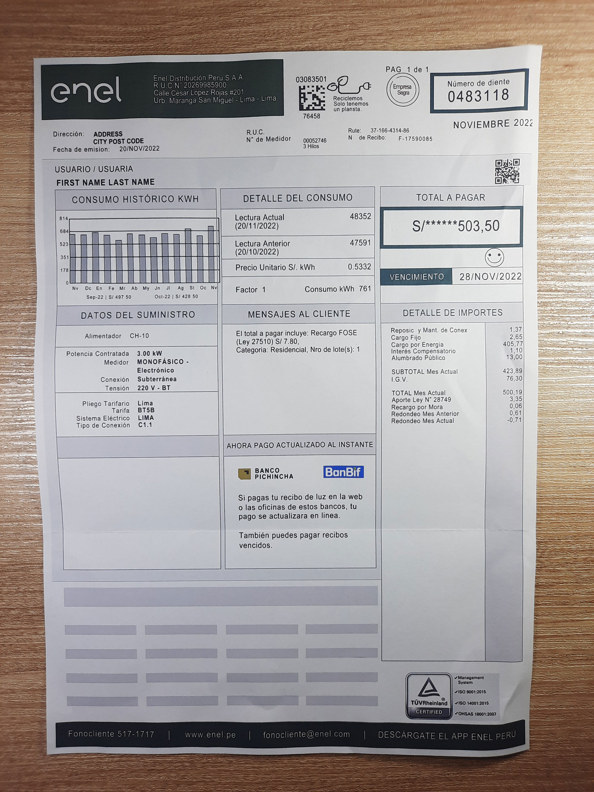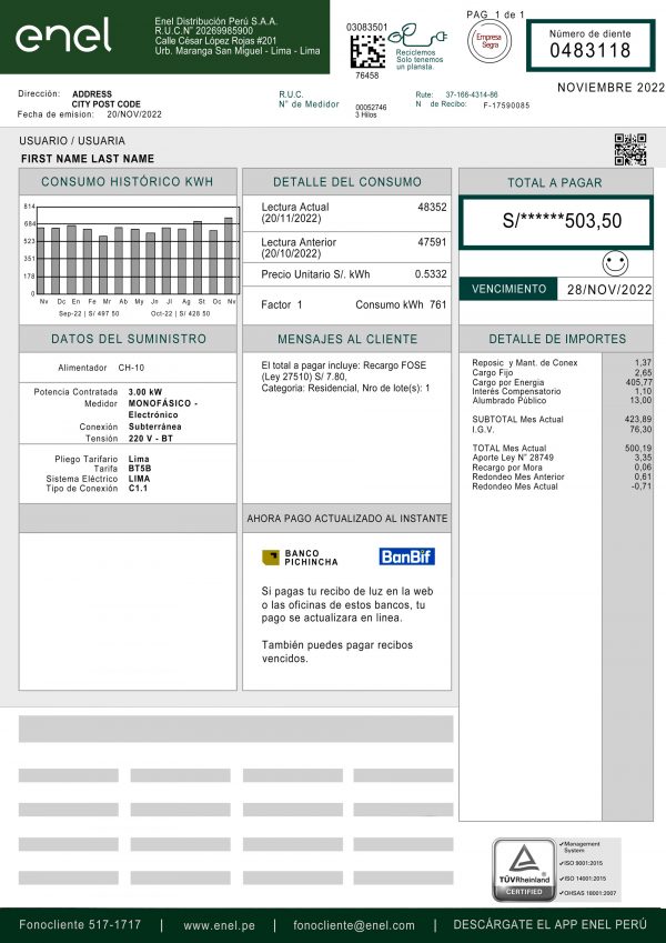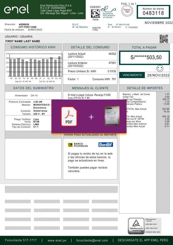 This file is suitable for all types of verifications. For example: for sites like paypal, payoner, paxful, binance, bets and poker web sites This Peru Callida utility bill template can be used for: