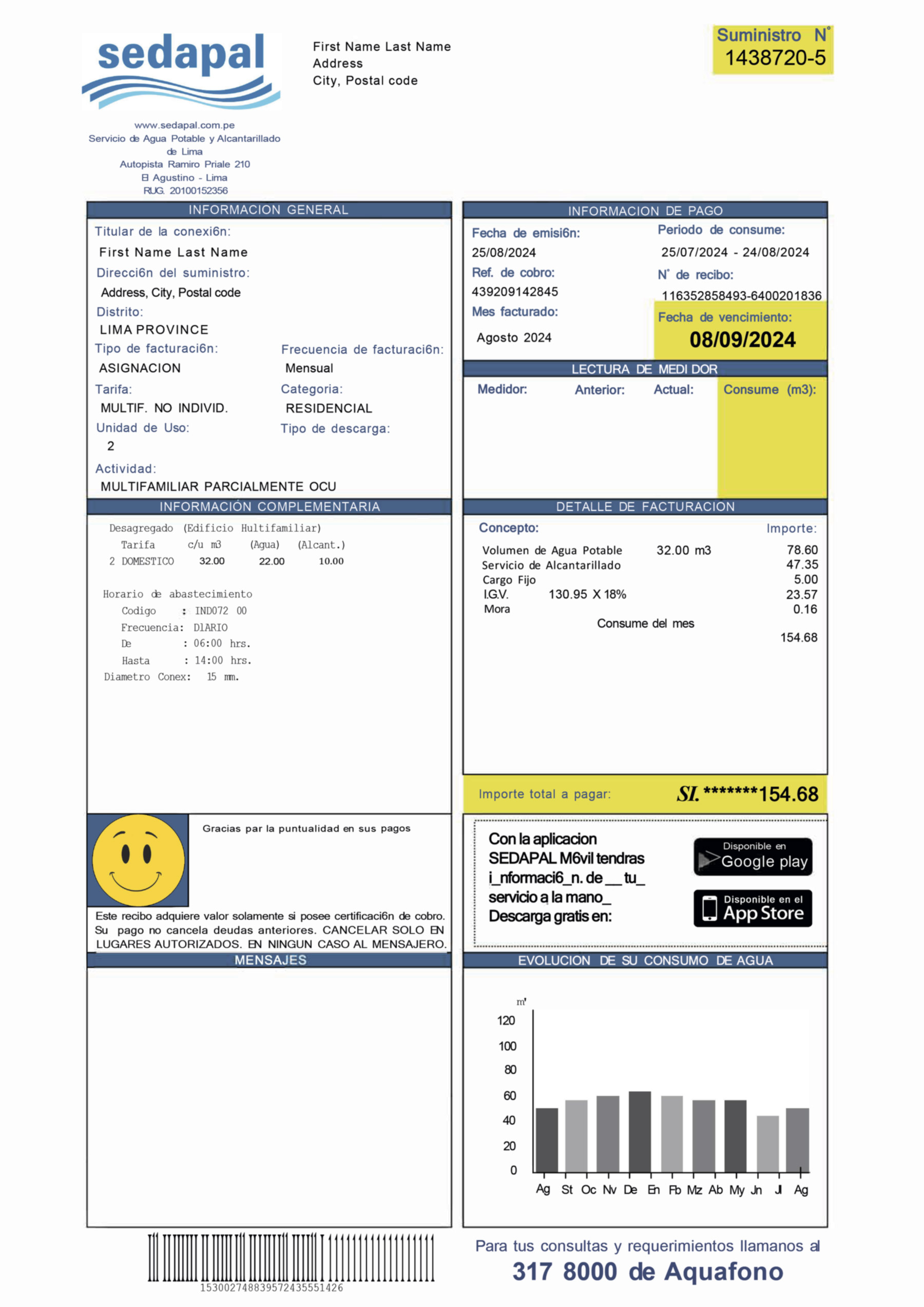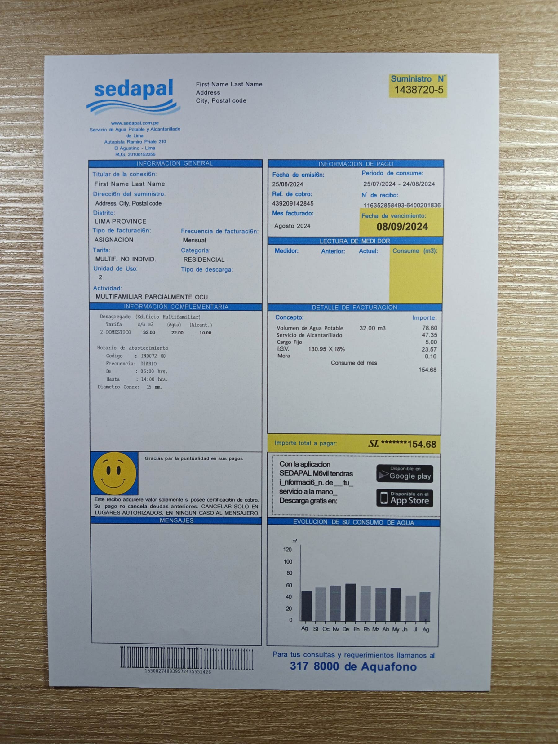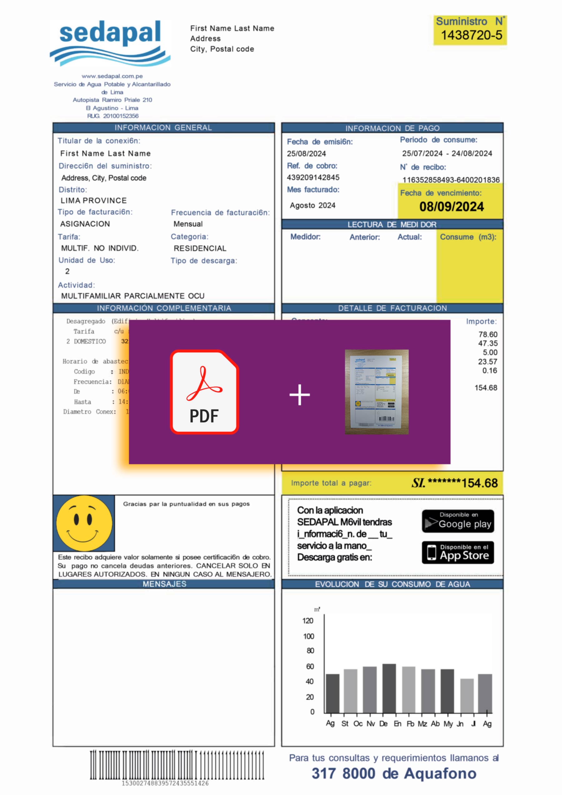 You’ll receive your files in JPEG or PDF + JPEG formats, both optimized at 300 DPI. The editable sections include customer name, service address, billing cycle, consumption data, and total charges. The structure follows Peru’s official utility bill format and arrives fully customized for your scenario. Orders include free revisions until approved, a 24-hour turnaround, secure checkout, and round-the-clock customer support.