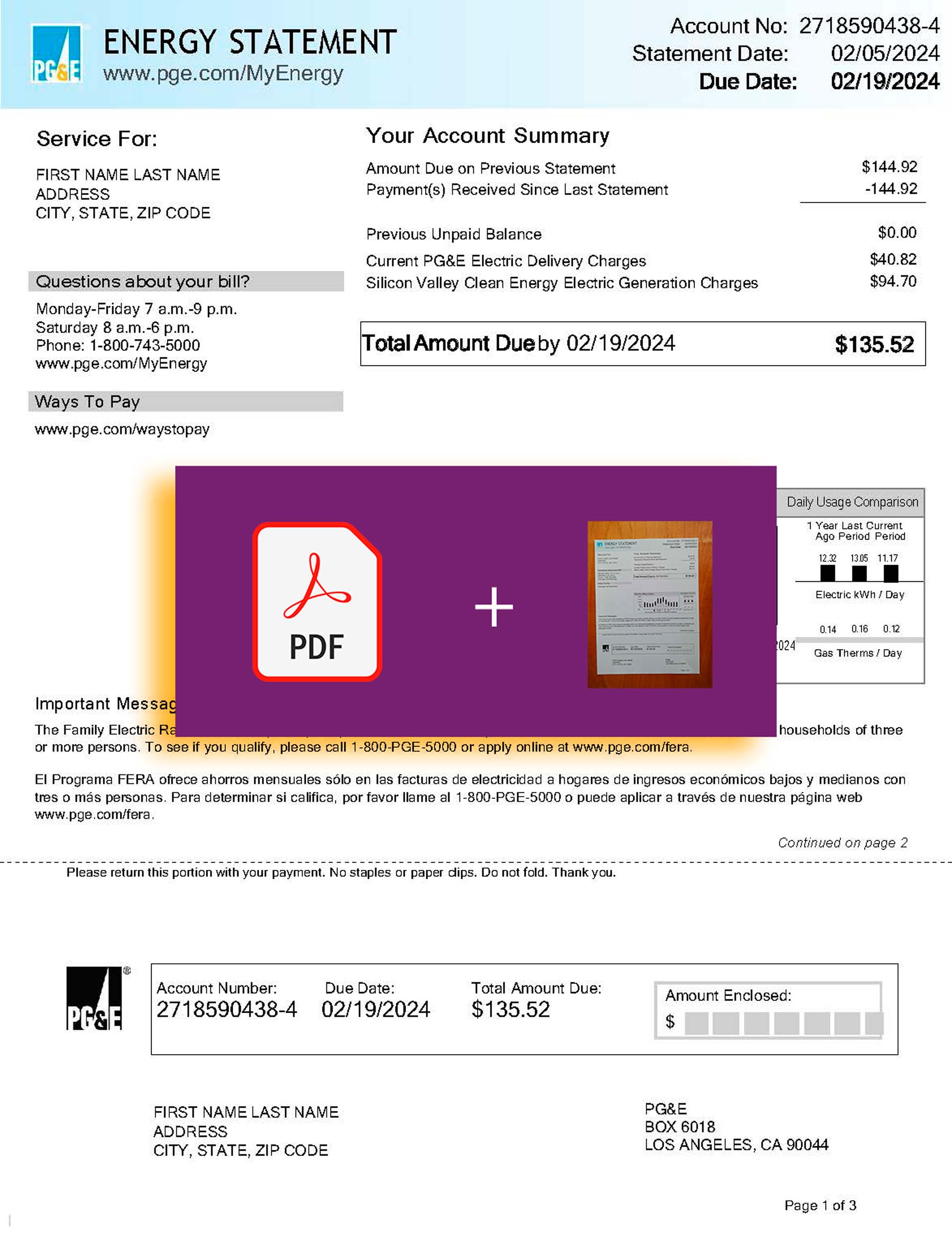 You’ll receive your PG&E bill in JPEG or PDF + JPEG format, fully editable and formatted to the provider’s official structure. The template includes editable fields such as customer name, service address, billing cycle, usage data, and payment totals. Files are high-resolution (300 DPI), include free revisions until approved, 24-hour turnaround, secure checkout, and full customer support available around the clock.