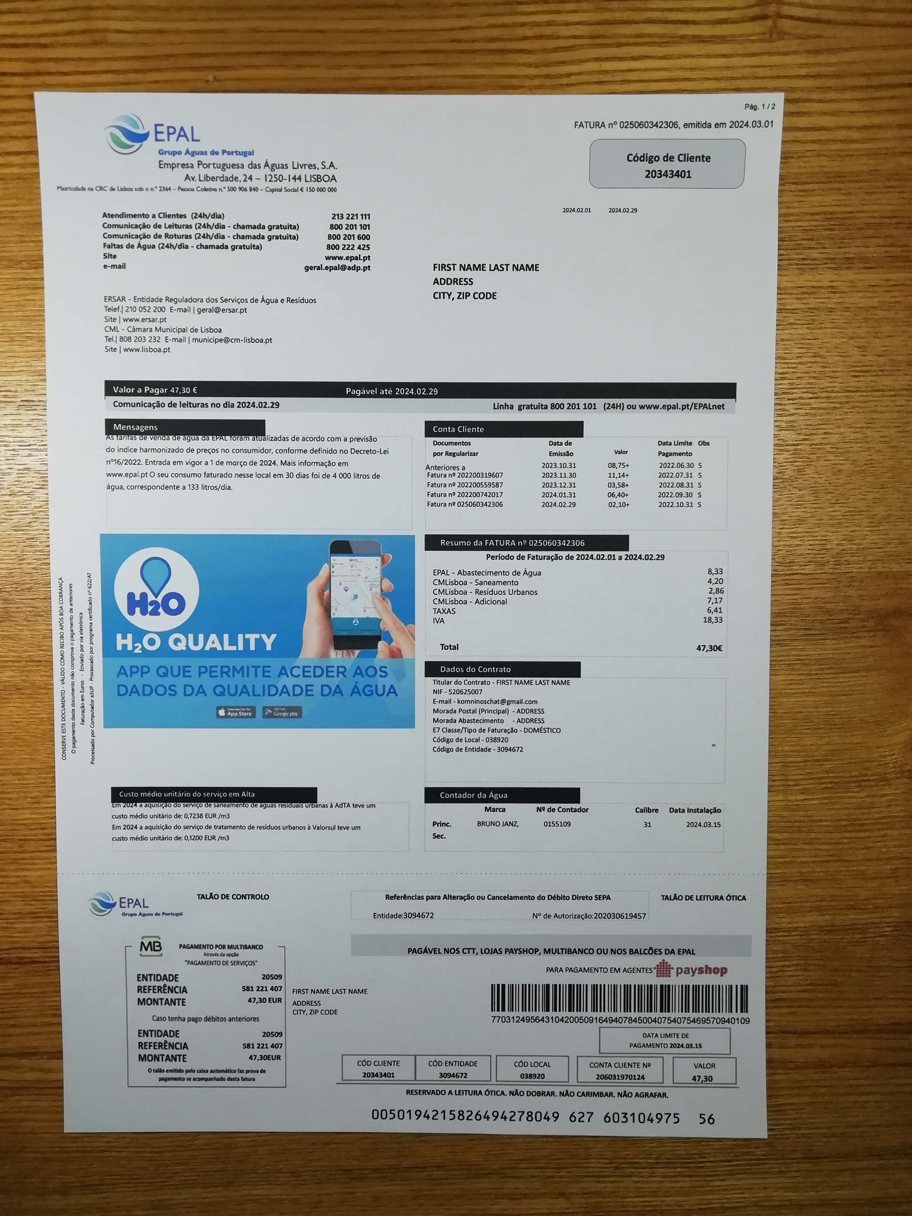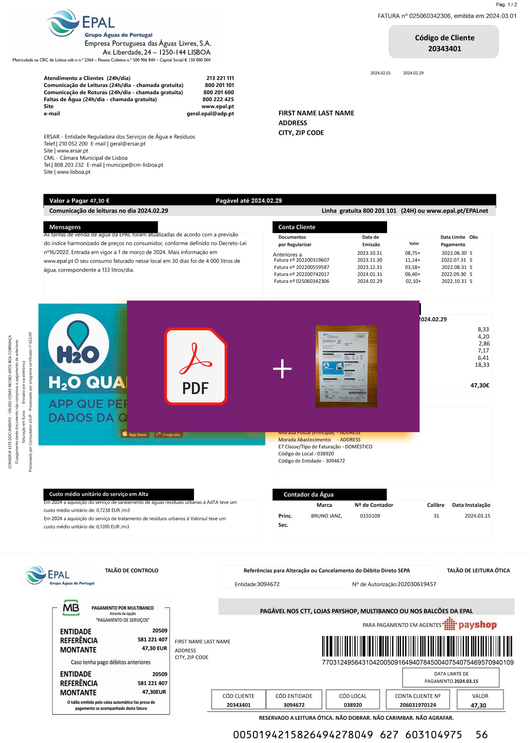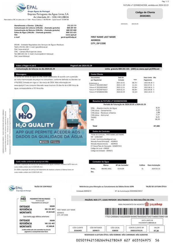 Your order includes both PDF and JPEG versions in crisp 300-DPI quality. The format follows Epal’s authentic Portuguese billing design and features editable sections such as customer name, service address, billing cycle, water usage, and total charges. The package comes with free revisions until approved, a 24-hour turnaround, secure checkout, and round-the-clock support for all users.