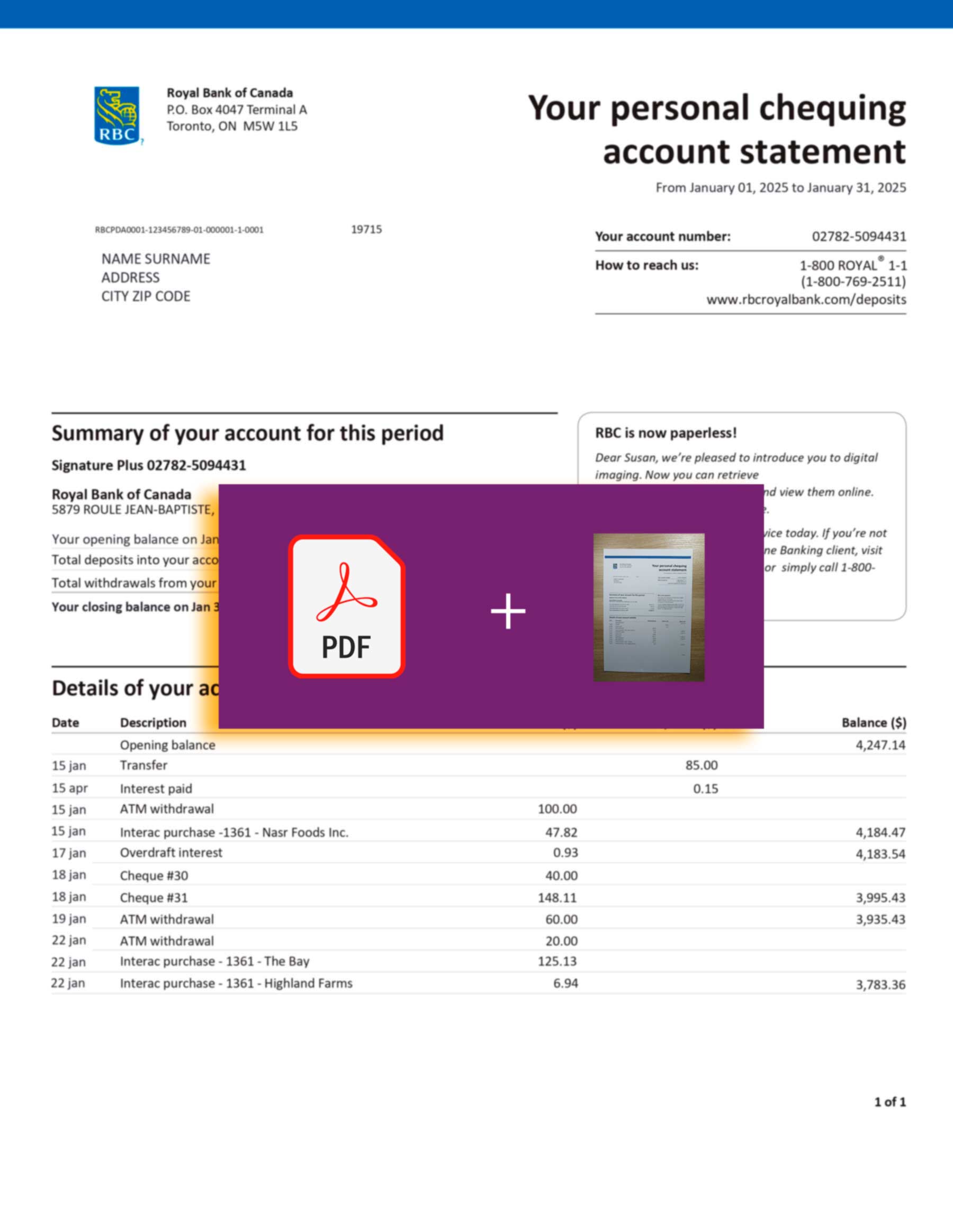 The package includes both JPEG and PDF + JPEG formats, designed at 300 DPI resolution for sharp clarity in print or screen applications. Each template follows the layout of an authentic RBC Canada statement, featuring editable elements for customer name, address, account details, billing period, and totals. Enjoy free revisions until approval, secure checkout, same-day turnaround (within 24 hours), and continuous 24/7 customer support.