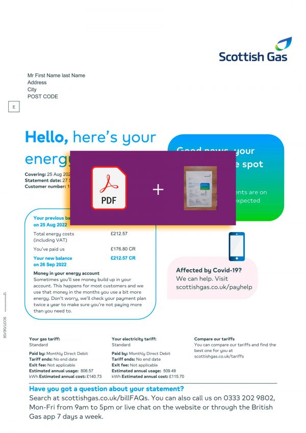 Just settled in Scotland and need a gas bill in your name before your first Scottish Gas statement makes its way through the letterbox. Share your details with the team and they’ll prepare a Scottish Gas bill in your name, sent directly to your email as a JPEG or PDF+JPEG. Covers Scotland and the wider UK, ready within 24 hours.