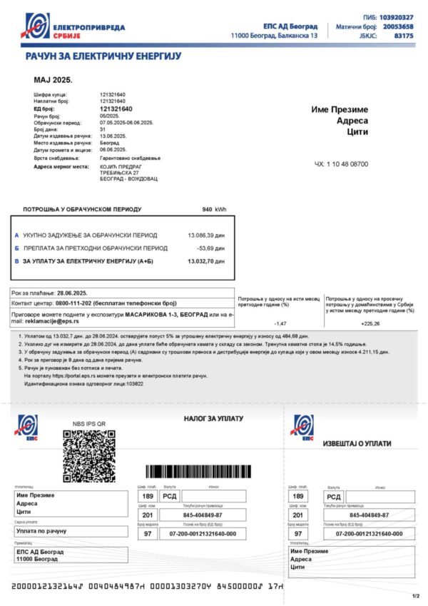 This EPS Serbia electric bill template is intended strictly for lawful and ethical use — including documentation verification, compliance audits, or UX simulations. It supports proof-of-address and KYC processes where legitimate, always following local and platform regulations.