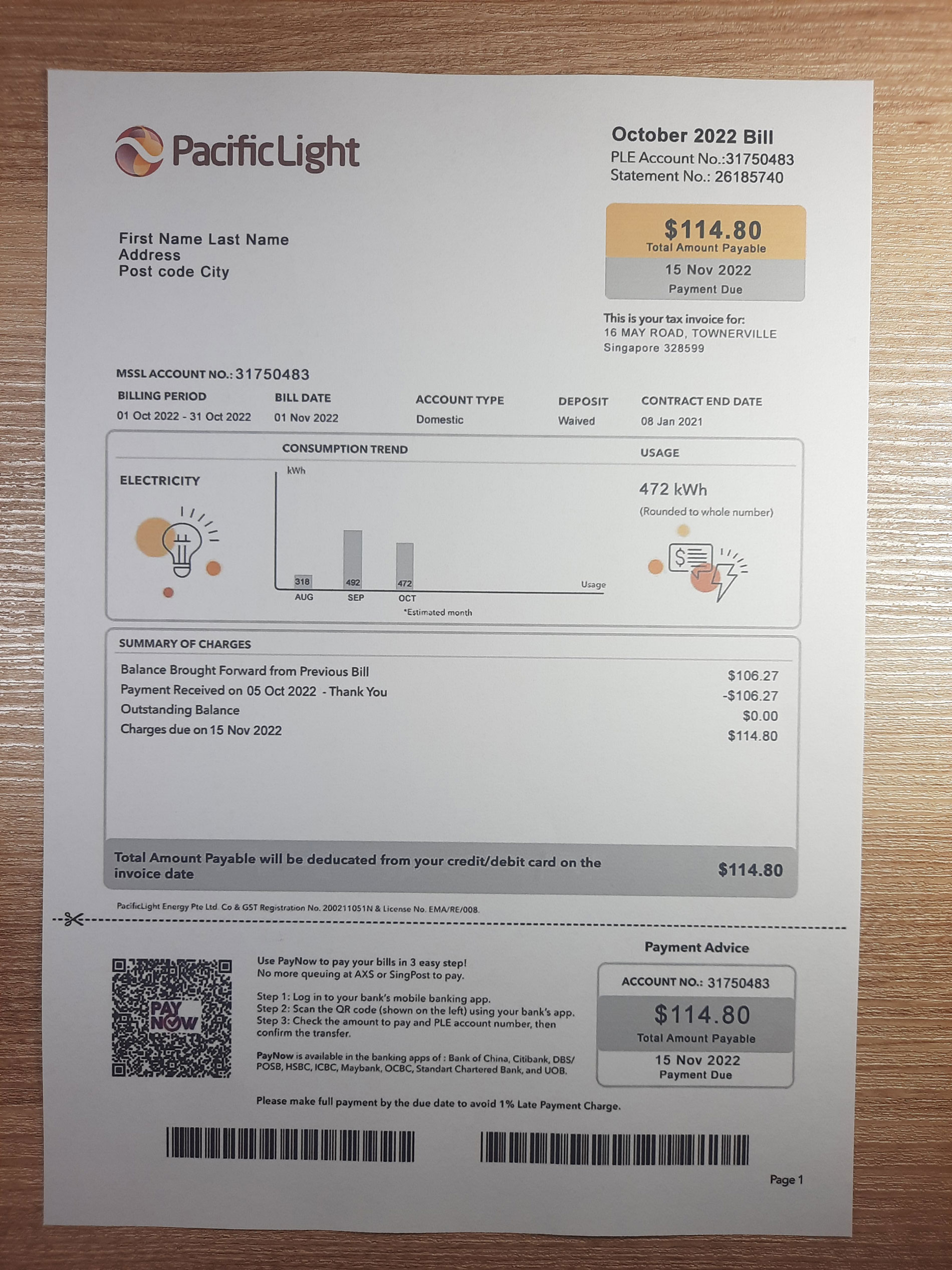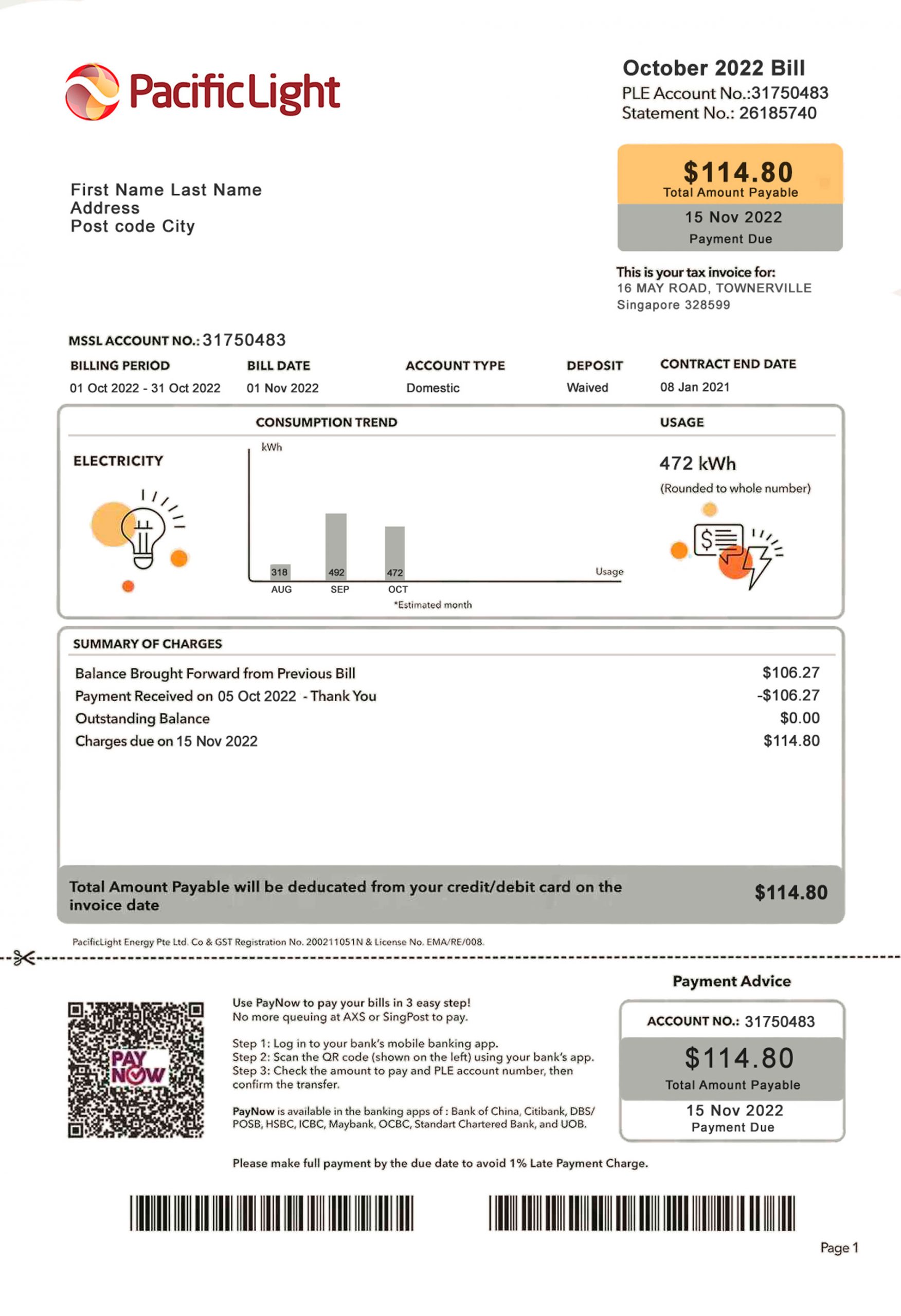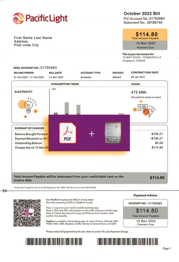 Your package includes editable PDF and JPEG formats, featuring the authentic layout used by Pacific Light in Singapore. You can customize fields such as customer name, address, billing cycle, usage data, and totals. All orders come with secure checkout, free revisions until approval, 24-hour turnaround, and round-the-clock support for a smooth, risk-free experience.