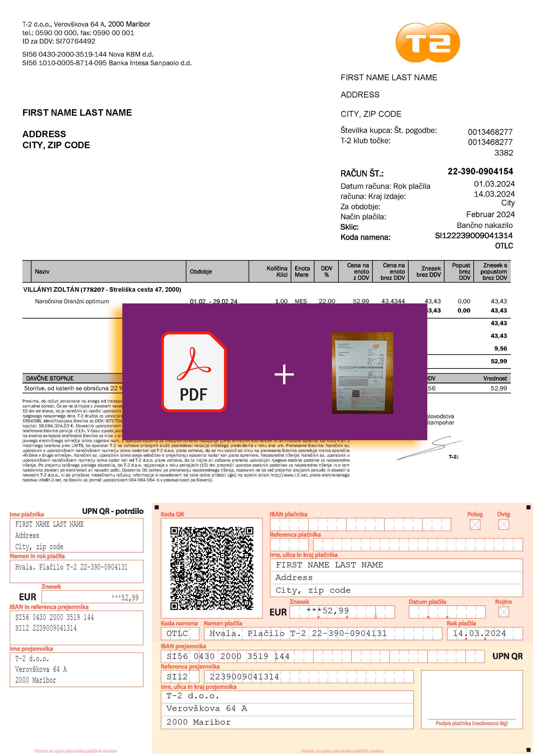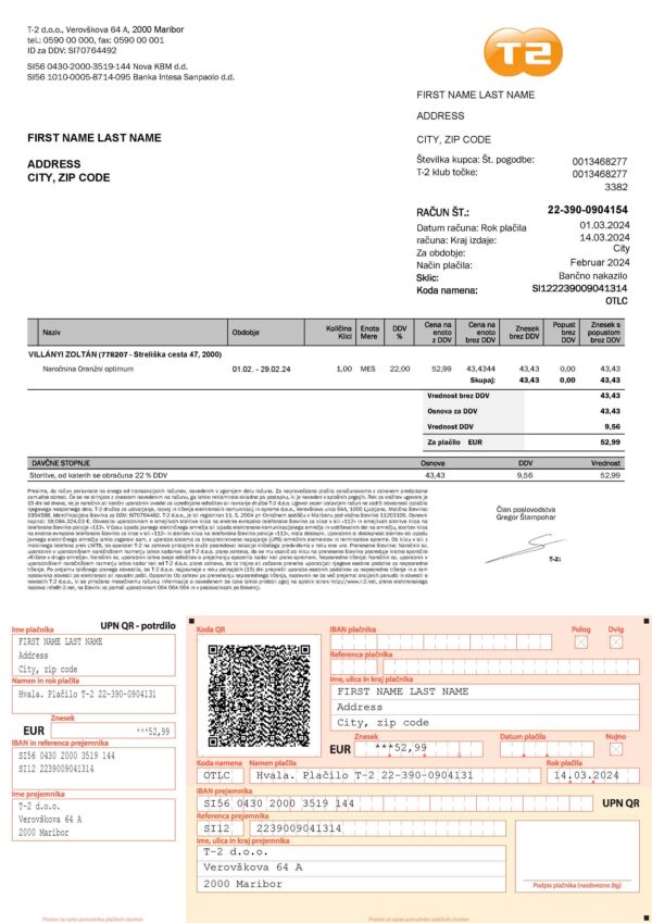 Your download includes JPEG or PDF + JPEG versions, both at 300 DPI for crisp and print-ready output. The layout follows the authentic T-2 Slovenia internet statement structure and features editable fields for customer name, billing address, period, internet plan details, and balance due. You’ll receive free revisions until approved, secure payment checkout, and full email support 24/7. Turnaround is typically within 24 hours, with quick delivery guaranteed for urgent projects.