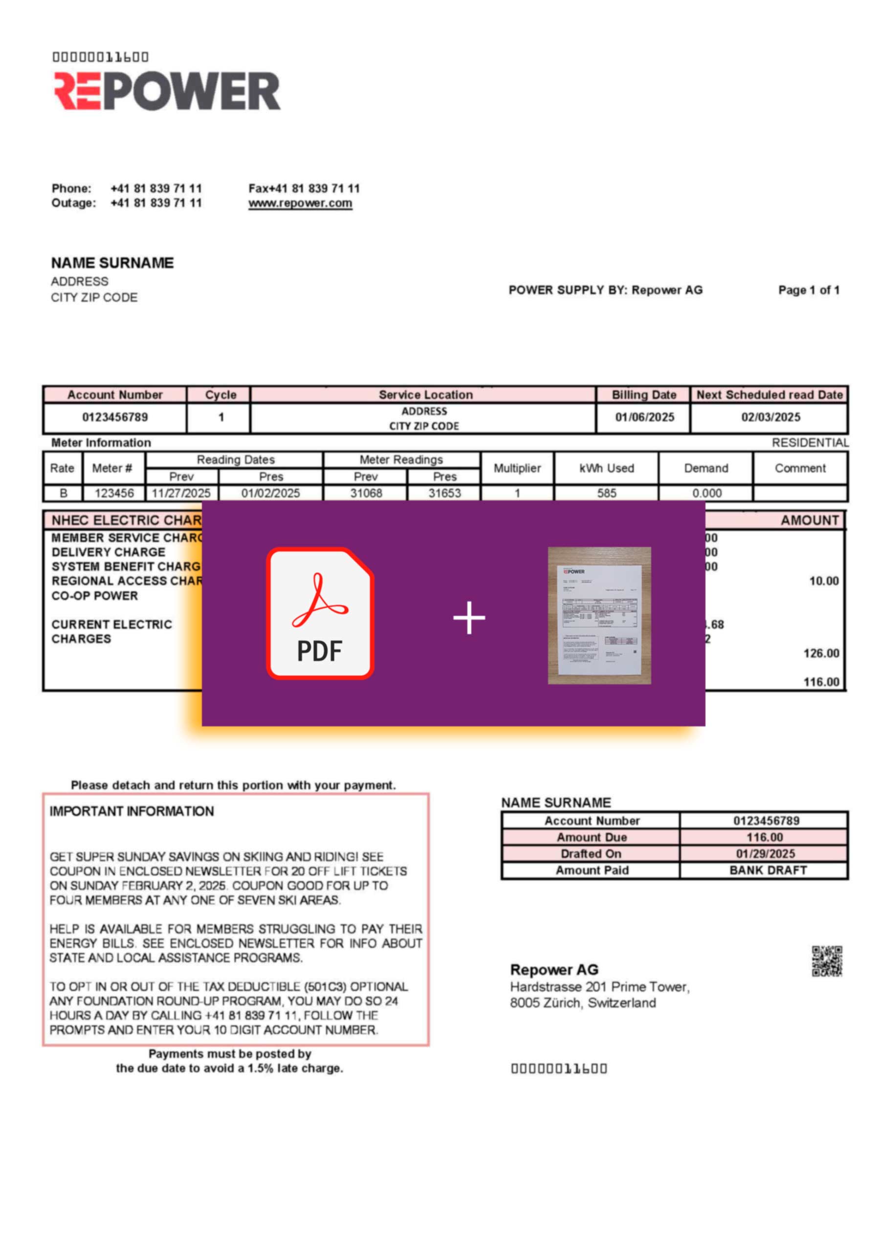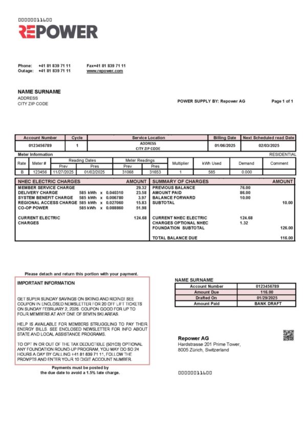 Includes JPEG or PDF + JPEG formats at 300 DPI for print or digital applications. The layout aligns with the Swiss RePower format and features editable fields for name, address, service number, billing cycle, and payment details. Every order comes with free revisions until approved, secure checkout, a 24-hour turnaround, and 24/7 customer support. Designed for professional workflows that demand precision and confidentiality.