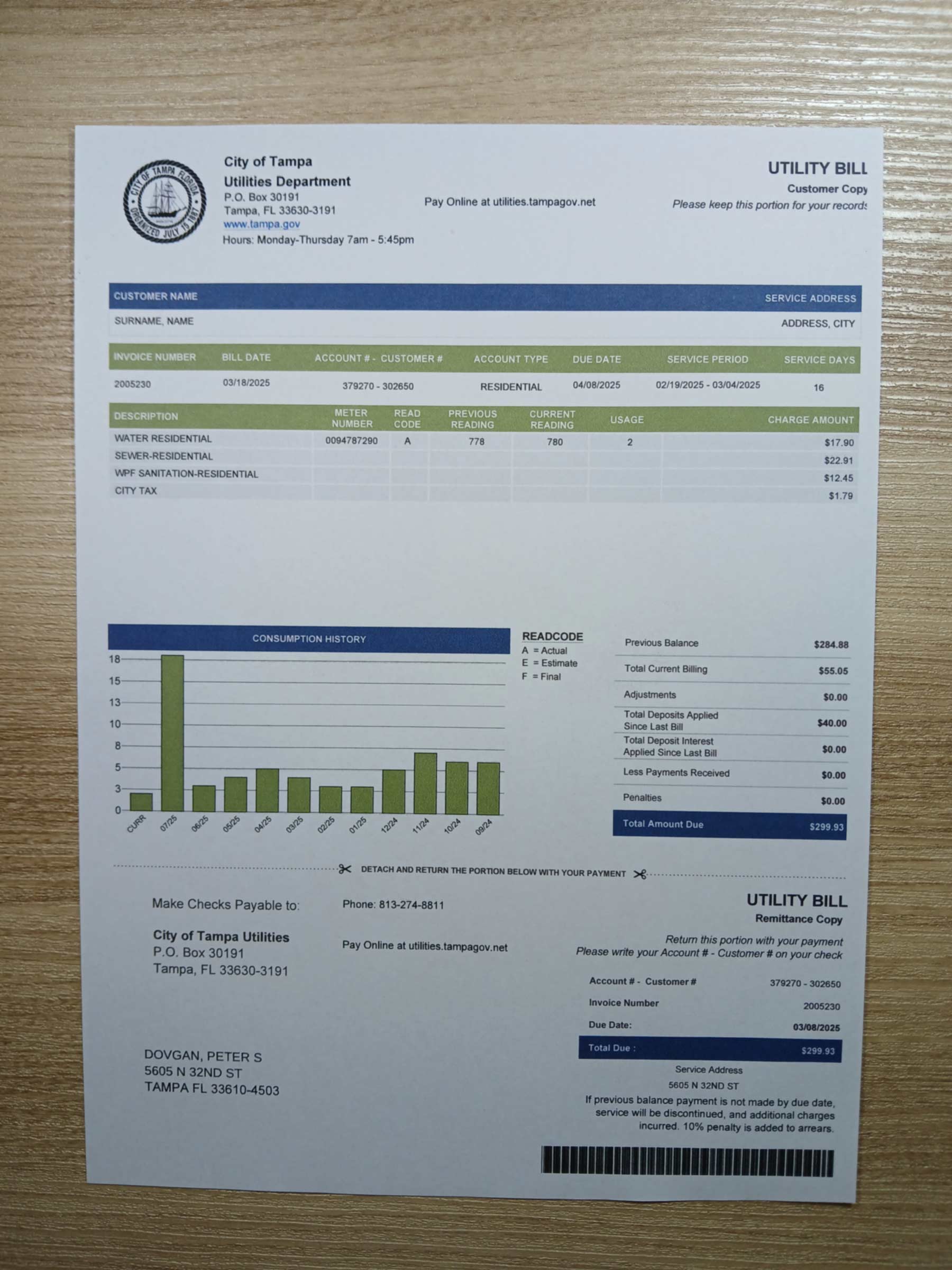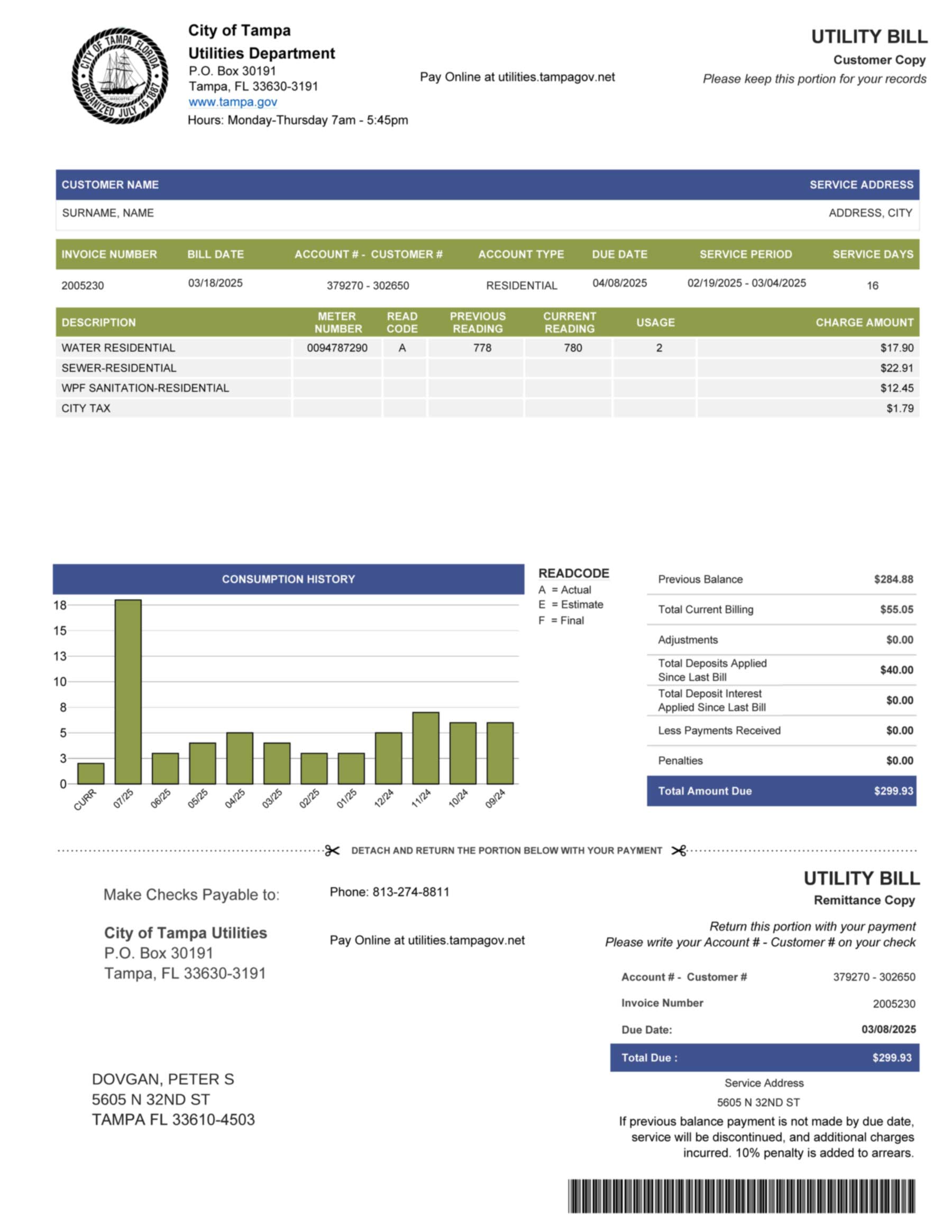 This editable City of Tampa water bill template for Florida (2025) offers a detailed and professional recreation of a municipal utility statement. Designed for UX simulation, documentation testing, and verification workflows, it features a high-resolution 300 DPI layout that mirrors the structure and formatting used in real Tampa water billing documents. The Done-For-You approach ensures your file is customized accurately for compliance, UI prototyping, or proof-of-address (POA) use cases.
