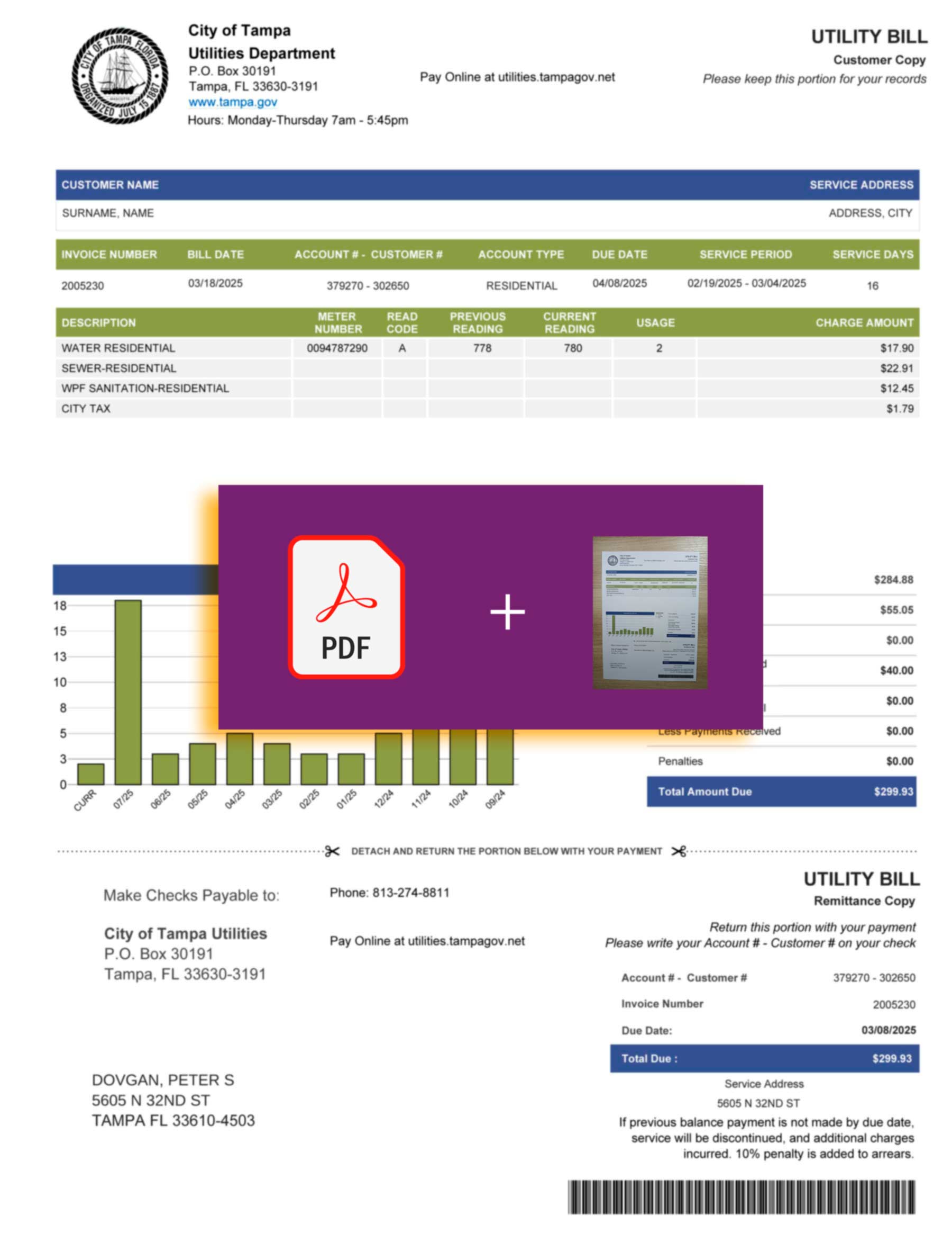 Editable fields include customer name, service address, billing cycle, water usage details, and totals. The layout stays consistent with Tampa’s municipal design and is compatible with Photoshop, Acrobat, and other popular PDF editors. Files are exported in 300 DPI for professional-quality display and testing.