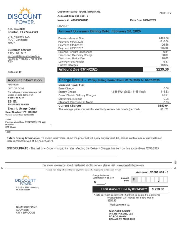 Your download includes JPEG or PDF + JPEG formats, following the authentic Discount Power layout used across Texas. Editable areas include customer information, service location, billing period, and itemized charges. Every order comes with free revisions until approved, secure payment processing, 24-hour turnaround, and 24/7 support for all customers.