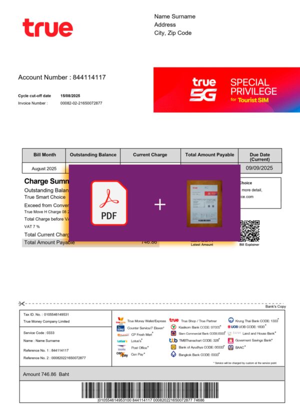 This editable True Thailand mobile bill is intended for lawful use — including demo presentations, document training, KYC verification reviews, and UX/UI visualization. It supports educational, compliance, and design-related scenarios only.