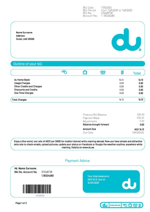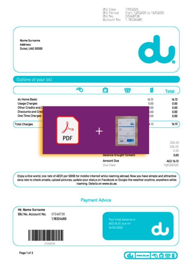 Includes JPEG or PDF + JPEG formats, formatted at 300 DPI for maximum clarity. The layout follows the official DU Internet structure used in the UAE, complete with editable sections for customer name, address, account number, billing cycle, and payment details. Each order comes with free revisions until approved, a secure checkout process, and guaranteed 24-hour delivery. 24/7 support ensures prompt updates and assistance at every stage.