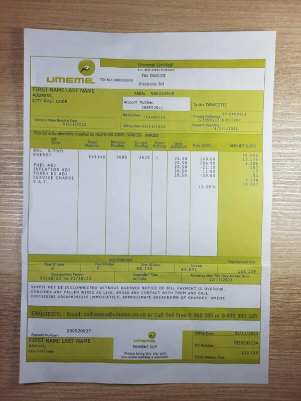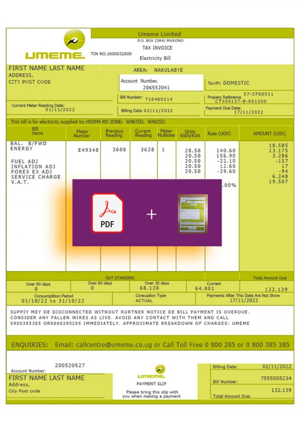 Your download includes PDF and JPEG formats, both produced at 300 DPI for crystal-clear quality. The layout reflects typical Ugandan electricity statements, featuring editable fields such as customer name, address, billing period, usage, and total amount due. Orders include secure checkout, free revisions until approval, 24-hour turnaround, and continuous 24/7 customer support for your peace of mind.
