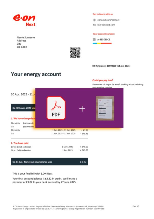 ✔ Accurately mirrors current E.ON billing layout used in the UK ✔ Editable content: name, address, billing date, usage data, meter info ✔ Provided in layered PDF and realistic JPEG (photographed) format ✔ Comes in both standard and banner-labeled versions ✔ Optimized for software testing, interface walkthroughs, and visual design tasks