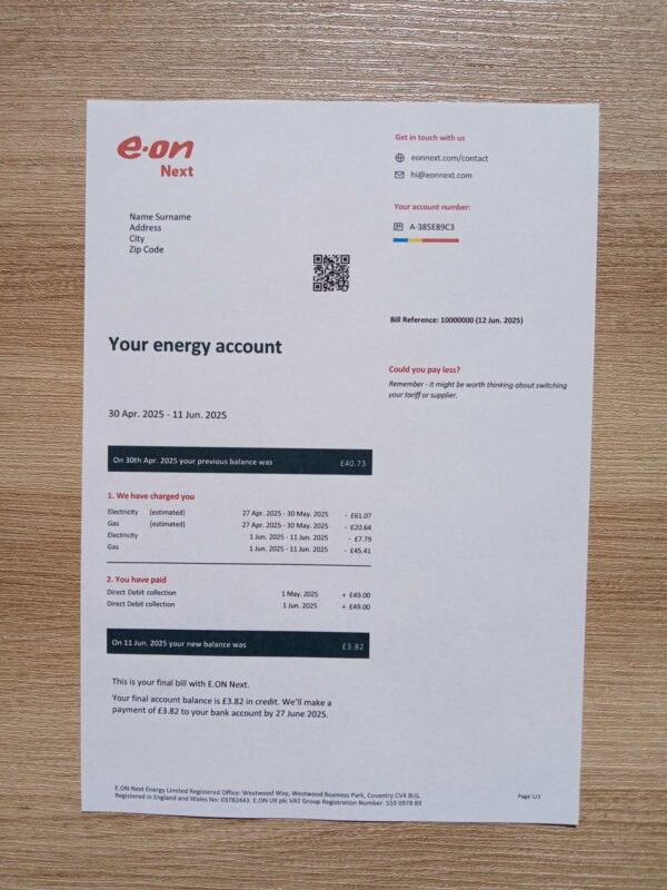 Start building, testing, or teaching with a modern and editable E.ON energy bill format — updated for accuracy, performance, and compliance in 2025.