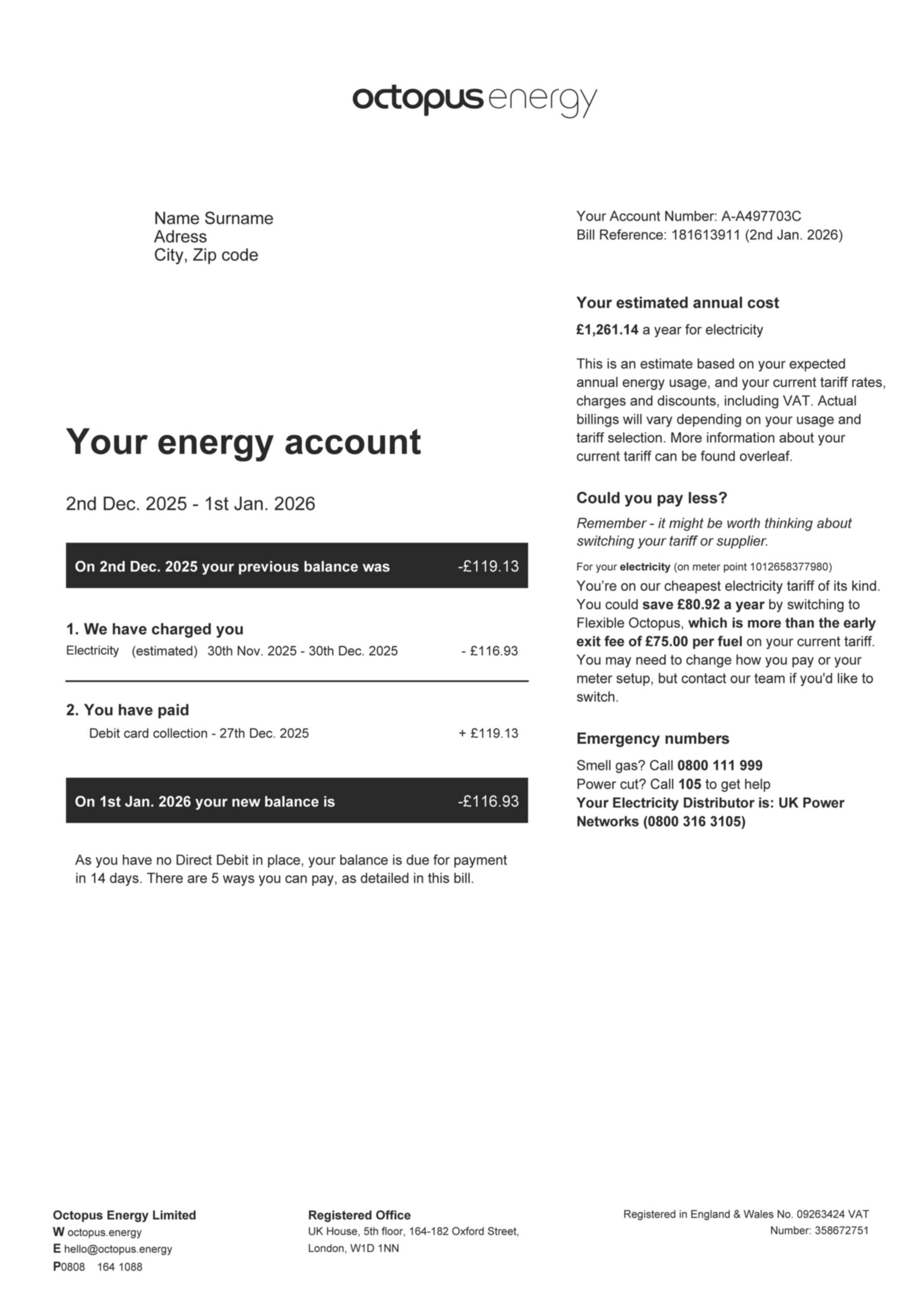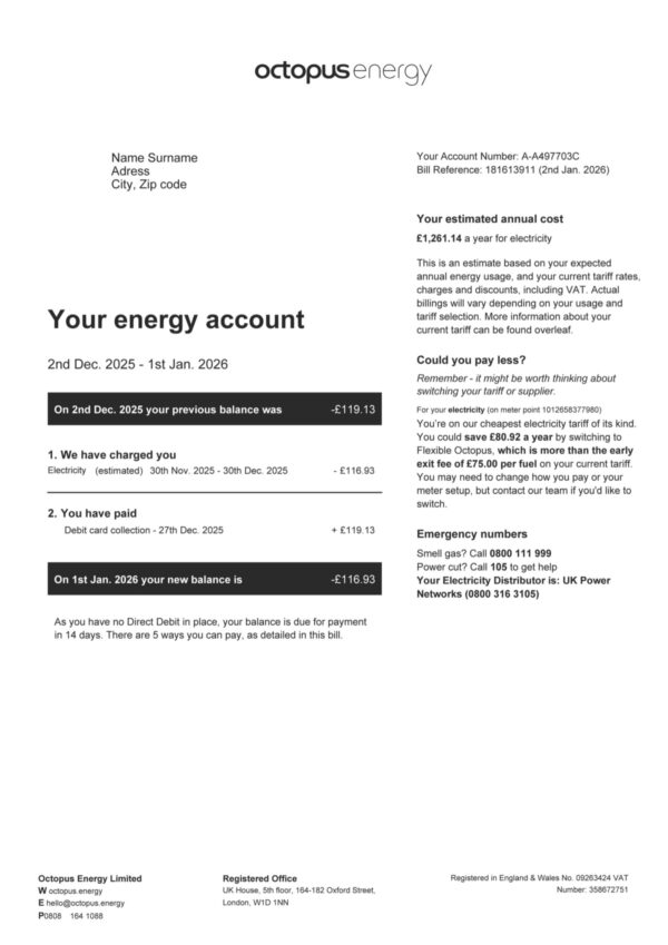 This editable Octopus Energy bill template – UK format for mock address validation – provides a clean, realistic energy statement layout designed for professional use. The file is crafted in 300 DPI for high-resolution clarity, ideal for developers, UX designers, and compliance testers conducting mock address verifications or interface simulations. Each section—from customer data to energy usage and billing totals—is editable, offering flexibility while maintaining the authentic Octopus Energy style.